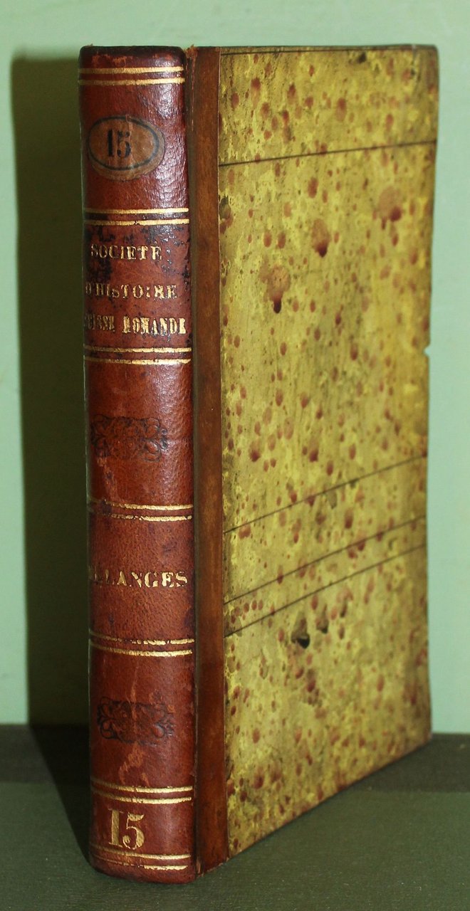 In 8°, pp. 396, (2). Mezza pelle dell'epoca. Dorso con titoli e filetti oro. Contiene: RICKLY. J., Chronique de Marius. - CHARRIÈRE, L. de, Le pieuré et la commune de Baulmes. - CHARRIÈRE, L. de, Quelques éclaircissement sur l'histoire del sires de Cossonay et de Prangins; Éclaircissement relatif à la situation de celui des châteaux de Mont qui appartenait aux sires de Prangins. - BLANCHET, Rod. Mémoire sur les monnaies des pays voisins du Léman, avec 8 planches.