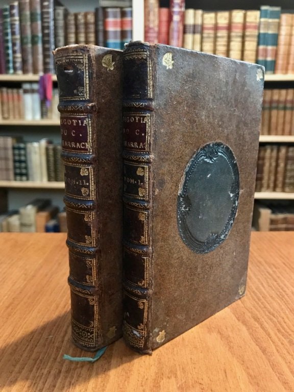 2 volumi in-8° (cm. 15,4), eleganti legature coeve in piena pelle con titolo e fregi in oro ai dorsi (usure) , piatti con ovale in nero al centro e fregi in oro agli angoli, tagli rossi, risguardi in carta marmorizzata; pp. [32] 291, [2] 381 [5] in stato molto buono, con lievi fioriture sparse. Prima edizione delle memorie dell'ambasciatore austriaco in missione alla corte spagnola per tentare di conservare la corona agli Asburgo su Madrid. Esemplare molto buono. (SD5)