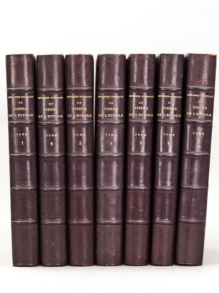 7 vol. in-8 reliure demi-maroquin chocolat, dos à 5 nerfs, Jouaust, Librairie des Bibliophiles, Paris, 1875-1879. Rappel du titre complet : Mémoires-Journaux de Pierre de l'Estoile. Edition pour la première fois complète et entièrement conforme aux manuscrits originaux (Tomes 1 à 7 ) Tome 1: Journal de Henri III 1574-1580 ; Tome 2 : Journal de Henri III 1581-1586 ; Tome 3 : Journal de Henri III 1587-1589 ; Tome 4 : Les Belles Figures et Drolleries ; Tome 5 : Journal de Henri IV 1589-1593 ; Tome 6 : Journal de Henri IV 1593-1594 ; Tome 7 : Journal de Henri IV 1505-1601 Très bel exemplaire réunissant les 7 premiers tomes, et malheureusement incomplet de 5 derniers (infimes frott. en coiffes, parfait état par ailleurs). Prix en l'état pour ces mémoires absolument passionnants, qui nous plongent en plein dans l'atmosphère du temps.