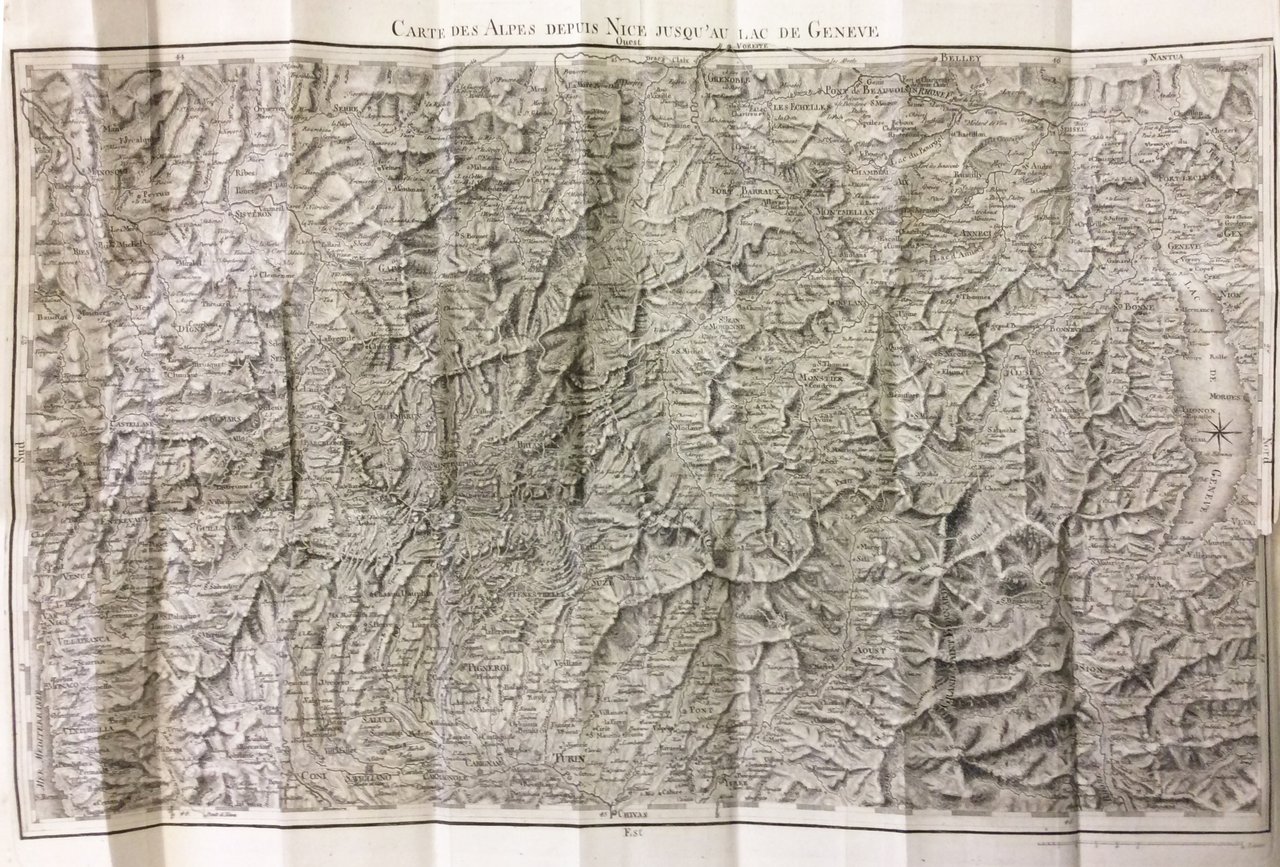 In-8 p. (mm. 215x123), mz. pelle con ang. coeva, fregi e titolo oro su tassello al dorso, tagli rossi, pp. XXII,416,(2), con una grande carta geografica delle Alpi Occidentali, molto dettagliata: depuis Nice jusqu'au lac de Genève, inc. in rame, e più volte ripieg.Vi sono raccolte 7 memorie: 1° Description militaire des frontières de la France, du Piemont et de la Savoie, depuis la mer Méditerranée jusqu'au lac de Genève, comprenant les places de guerre, forts, chateaux, ecc.; les vallées, cols et chemins des Alpes - 2° La vallée de Barcelonnette - 3° Plan de campagne pour entrer de France en Piémont - 4° .. pour empecher le roi de Sardaigne de pénétrer de Piémont en France - 5° La défence du Var - 6° Les frontières de France depuis le confluent du Guiers et du Rhone jusqu'à la vallée de Barcelonnette - 7° Interet qu'à la France de réunir à son territoire les vallées du Briançonnais, cedées au roi de Sardaigne par le traité d'Utrecht. Memorie del celebre generale, cartografo e scrittore francese Pierre de Bourcet (1700-1780). Napoleone si ispirò alla sua dottrina nei piani di attacco all'Austria, dalla Germania e dall'Italia.Pagine ingiallite per la qualità della carta ma certam. un buon esemplare. Raro trovarlo completo della grande carta delle Alpi.
