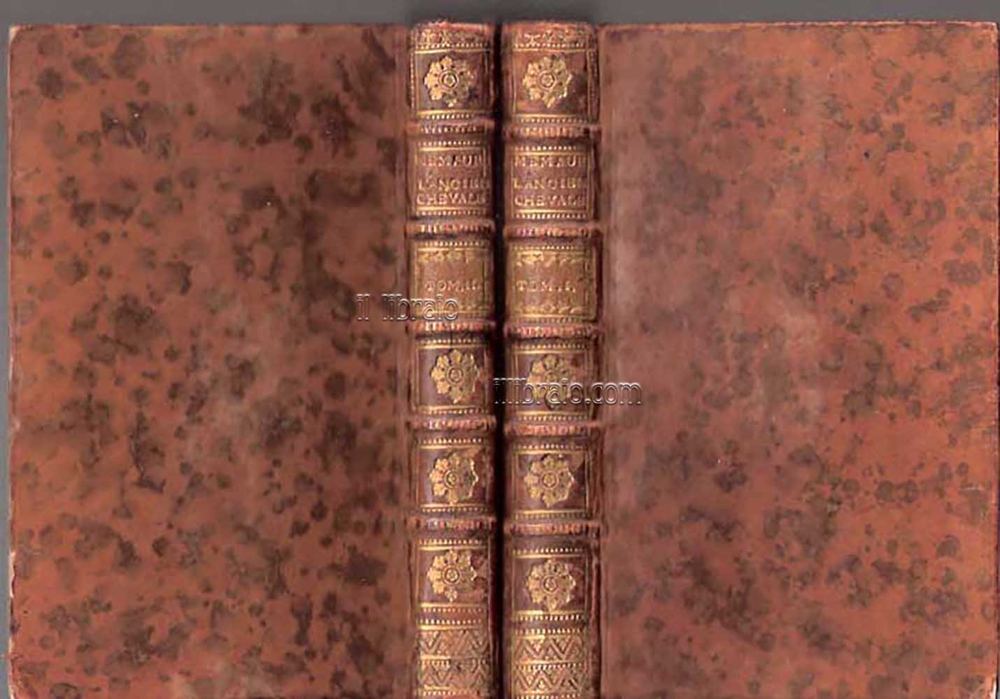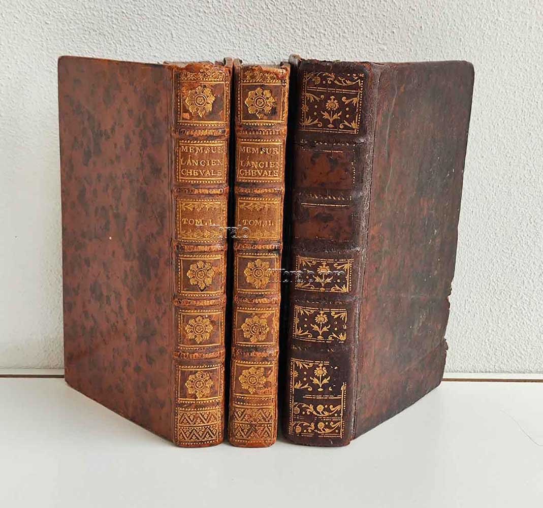 2 voll.; in 16°; pp. XI (1), 391 (1); (4) 317 (3); VI, 456 (2); leg. coeva in piena pelle con ricchi fregi e titolo impressi in oro al dorso; unghiatura decorata; tagli colorati rossi (il 3° vol. ha una legatura in pelle di colore differente perchè fu rilegato in un epoca successiva); 1^ ed. definitiva. Questa importante e rara opera in edizione originale contiene oltre alle cinque memorie corredate dalle erudite note dell'autore, che formano un trattato completo sull'antica cavalleria, una dissertazione sulla lettura degli antichi romanzi cavallereschi, estratti di poesie provenzali, uno scritto sulle antiche onoranze della corte di Borgogna, interessante per la conoscenza delle usanze cavalleresche. Cfr. Brunet V, 65. Thiebaud (543). Il terzo volume contiene un'abbondante serie di documenti interessanti sulla storia della caccia in Francia. (Primi 2 voll. in condizioni molto buone, il 3° presenta un restauro alla cerniera e al contropiatto superiore, il piatto superiore ha una piccola abrasione ad un lato; internamente la legatura è molto solida ed in buone condizioni generali)