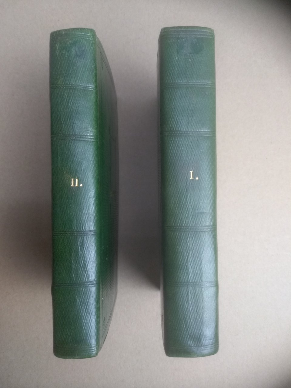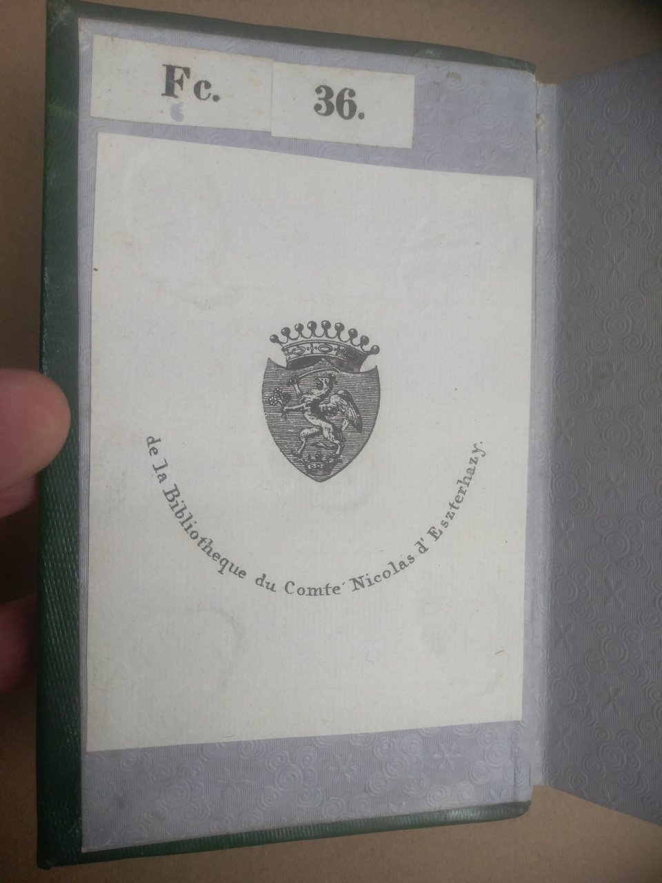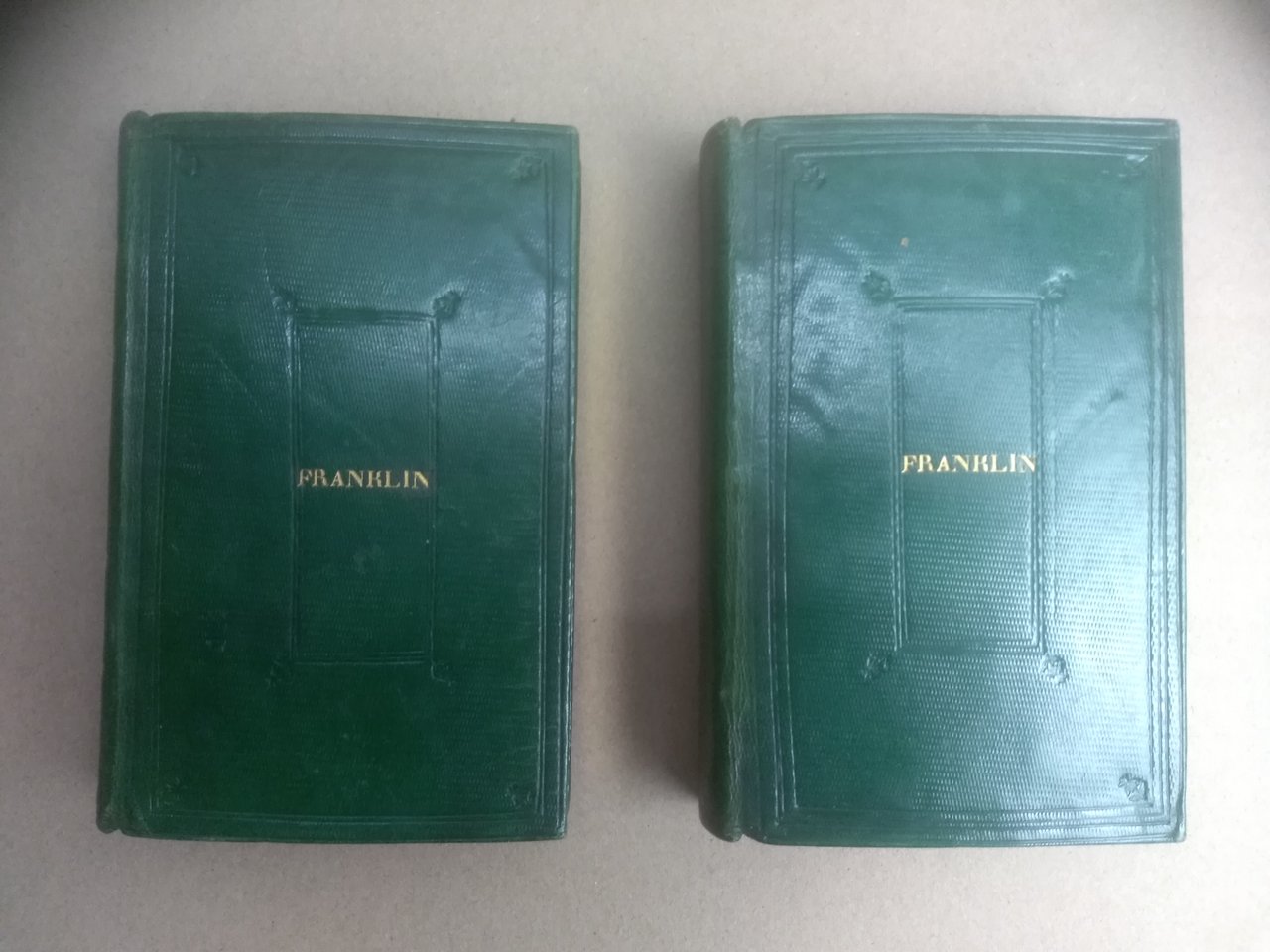 Due volumi (9x14 cm) di VIII-347 e (4)-257-(2) pagine. Ritratto inciso in antiporta dei due volumi. In lingua francese. "This is a new translation of the autobiography, made by A. C. Renouard, from the Le Veillard ms. It contains the fourth part of the autobiography, and was the first appearance in print of it."--P. L. Ford's Franklin bibliography, 1889. p. 191. - Ex libris nobiliare Comte Nicolas d'Esterhazy al retro del piatto del primo volume; timbro con corona reale alle due pagine di titolo; bollo alla fine del primo vol. Belle legatura in tutta pelle marocchina verde olivo, con duplice cornice a secco ai piatti con il nome Franklin in oro; dorso liscio con i due numeri di tomagione dorato. Tagli dorati. Ottime condizioni. Grande provenienza e rilegatura per questa autobiografia di Franklin, curata da Renouard.