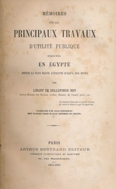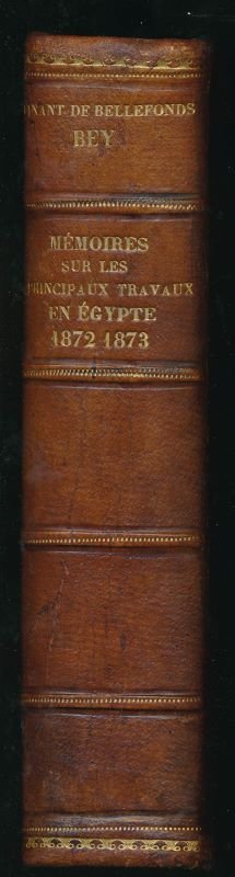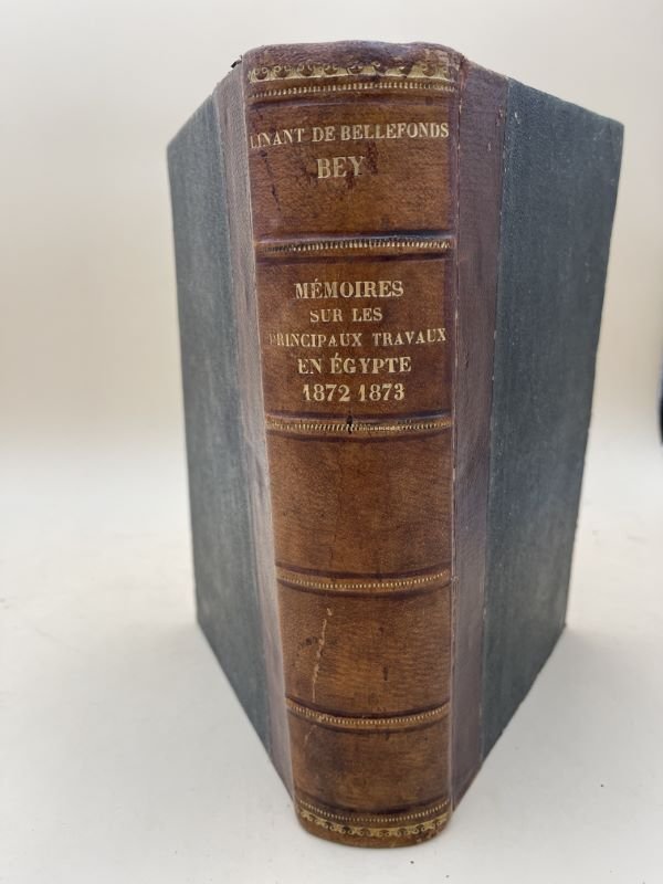 Arthus Bertrand 1872 Paris, Arthus Bertrand, 1872 - 1873. Fort volume grand In-8 relié demi-chagrin havane, dos à nerfs soulignés de pointillés dorés, guirlande dorée en tête et en queue. VII (errata et avant propos) + 620 pages. Quelques rousseurs sans gravité. Exemplaire bien relié. Sans l'atlas annoncé. LINANT de BELLEFONDS, né à Lorient en 1799, Explorateur et surtout Ingénieur en Chef des Travaux de la Haute Egypte (1831-1835) puis des canaux, ponts et chaussées de tout le pays et enfin Ministre des Travaux Publics et Membre du Conseil privé du Vice Roi. Cet ouvrage relate tous les travaux, notamment de canalisation, qu'il a dirigé et notamment le CANAL de SUEZ dont il est le véritable initiateur, qui en définit le tracé et mis en place le chantier. On a fréquemment dit de lui qu'il était le véritable père" du Canal de SUEZ. Bel exemplaire