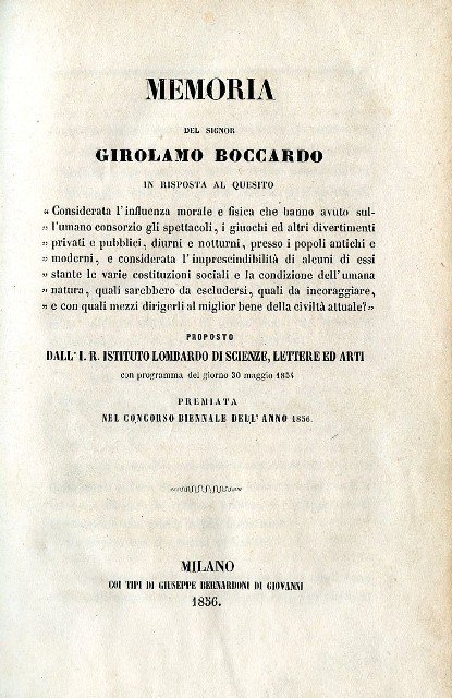Memoria in risposta al quesito 'Considerata l'influenza morale e fisica che hanno avuto sull'umano consorzio gli spettacoli, i giuochi ed altri divertimenti privati e pubblici, diurni e notturni, presso i popoli antichi e moderni e considerata l'imprescindibilità di alcuni di essi stante le varie costituzioni sociali e la condizione dell'umana natura, quali sarebbero da escludersi, quali da incoraggiare, e con quali mezzi dirigerli al miglior bene della civiltà attuale ?'.