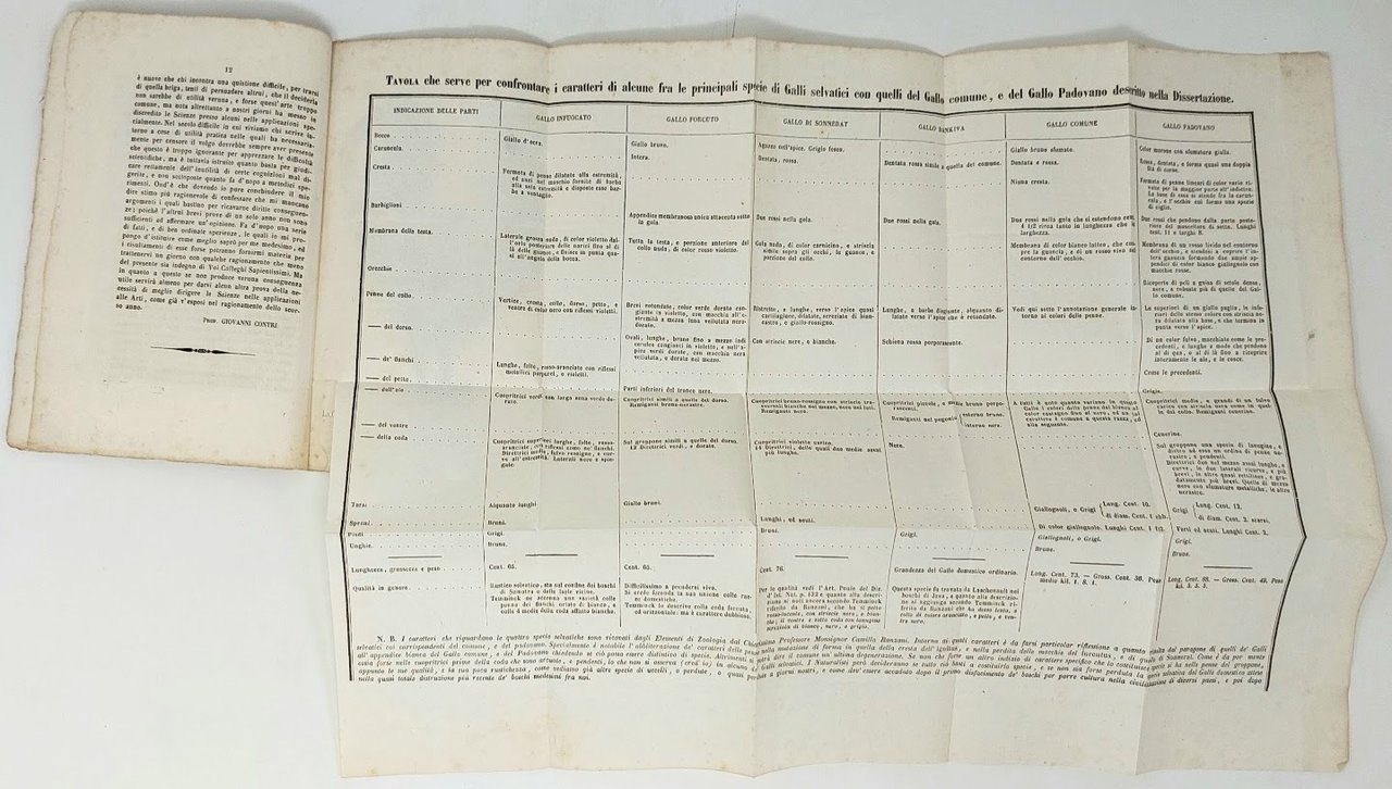 >in-12, pp. 12 con allegata una tavola f.t. che ''serve per confrontare i caratteri di alcune fra le principali specie di Galli selvatici con quelli del Gallo comune e del Gallo Padovano descritto nella dissertazione'' e una litografia a p. pagina raffigurante il Gallo padovano, legatura in carta decorata. Interessante e raro opuscolo di una Memoria letta all'Accademia delle Scienze dell'Istituto di Bologna nel 1833. In buono stato.