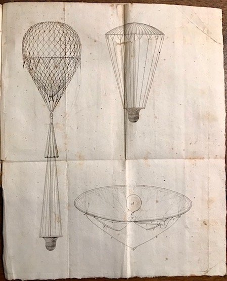 16mo (cm. 16), 36 pp., 1 c.nn. Con una tavola calcografica ripiegata in antiporta. Carta marmorizzata policroma. Lievi fioriture sparse. Opuscolo assai raro, presente secondo ICCU in due sole bibl. italiane. Provenienza: Collezione Moretti, Roma (timbretto ex libris al frontespizio). L'anonimo autore in questa breve memoria, dopo un'introduzione storica, si sofferma sulla costruzione e conduzione degli aerostati.
