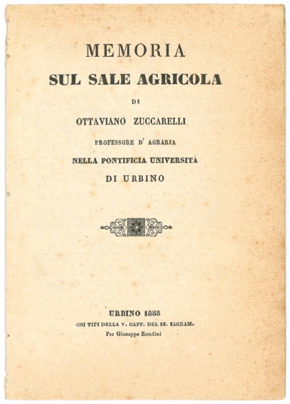 Mm. 198x140. Pp. 15. L'autore nel breve volume tratta il tema della mortalità del bestiame e illustra la ricetta del sale agricola da somministrare agli animali malati. Opuscolo editoriale con titolo alla copertina anteriore. Lievi mancanze al dorso, copertina marginalmente brunita. Prima ed unica edizione.