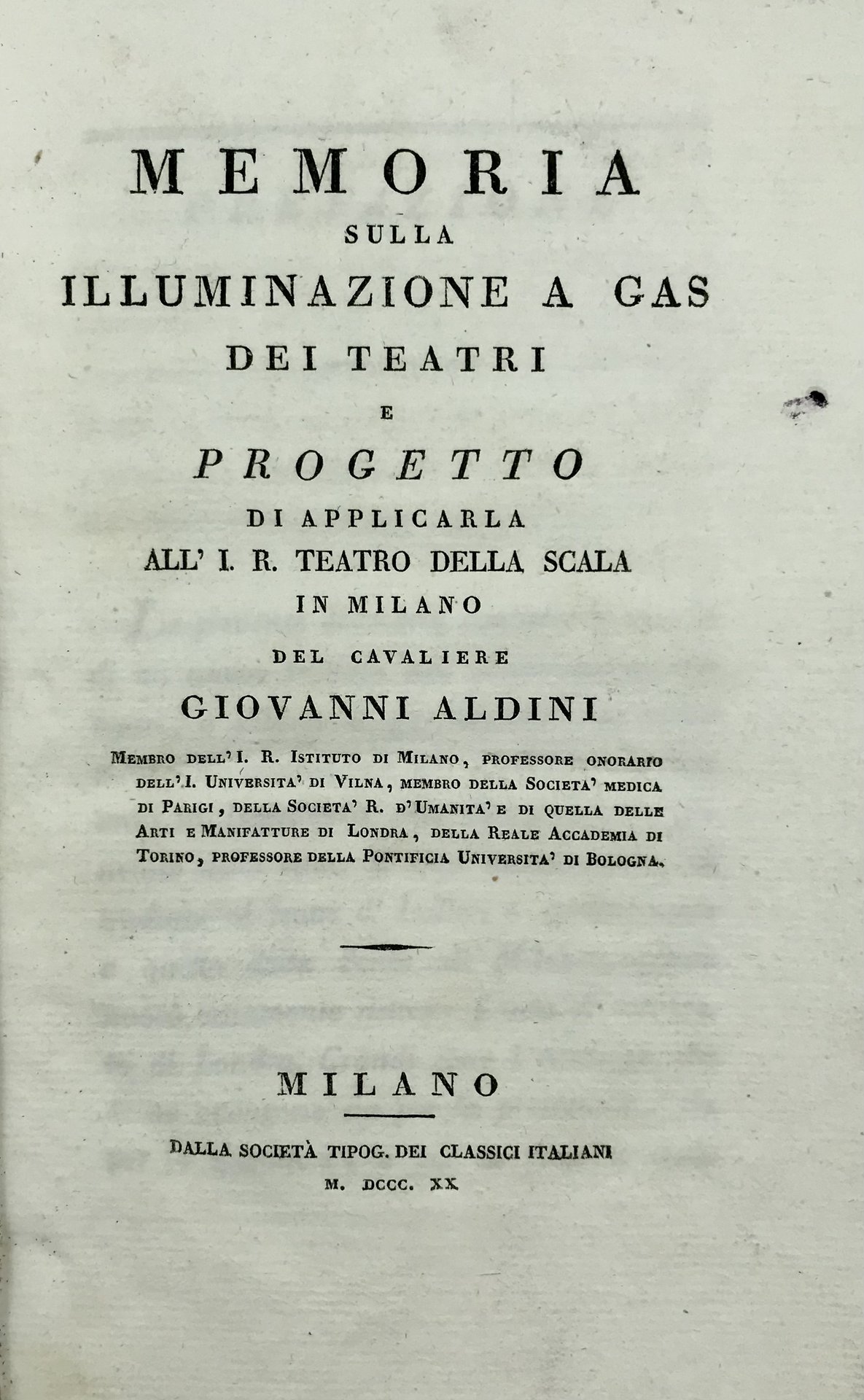 Prima e unica edizione, non comune. Il fisico bolognese Giovanni Aldini, nipote di Luigi Galvani, espone in questo saggio le sue convinzioni in merito all’uso del gas estratto dal carbone fossile e dal petrolio per una migliore illuminazione dei teatri, seguendo l’esempio della sperimentazione fattane a Londra. Forte di questo, Aldini coinvolse l’Imperial Regio Istituto e la Direzione del Teatro alla Scala all’applicazione sperimentale del suo metodo d’illuminazione a gas delle sale, mostrando i vantaggi d’uso e di resa rispetto alle lampade ad olio sino ad allora utilizzate. L’esperimento di Aldini, pur pioneristico, non trovò realizzazione concreta, osteggiato dall’amministrazione austriaca; solo 14 anni più tardi la sua intuizione fu applicata illuminando a gas la galleria De Cristoforis a Milano
