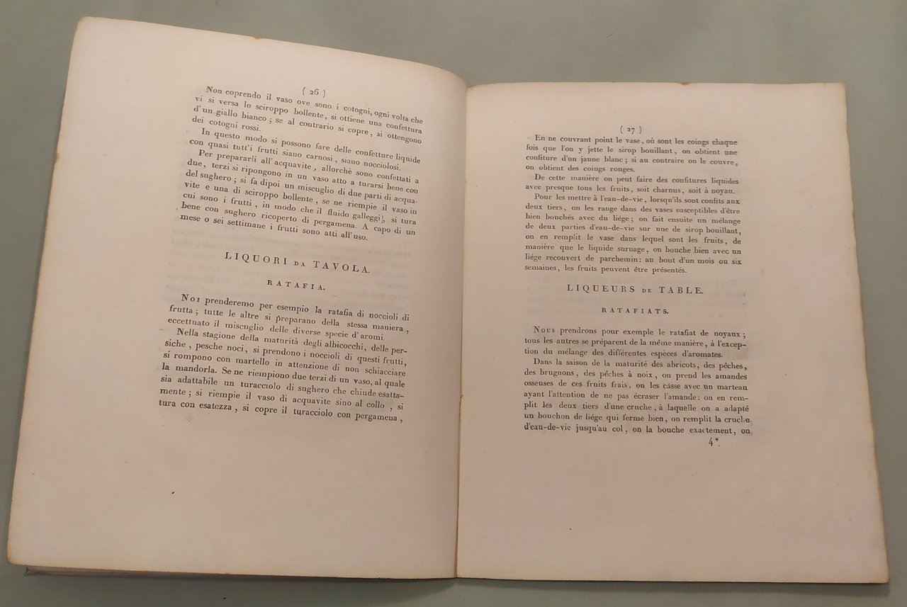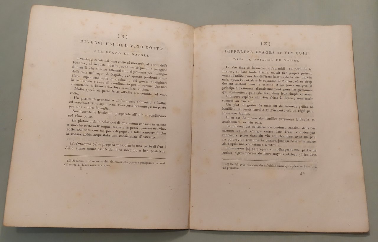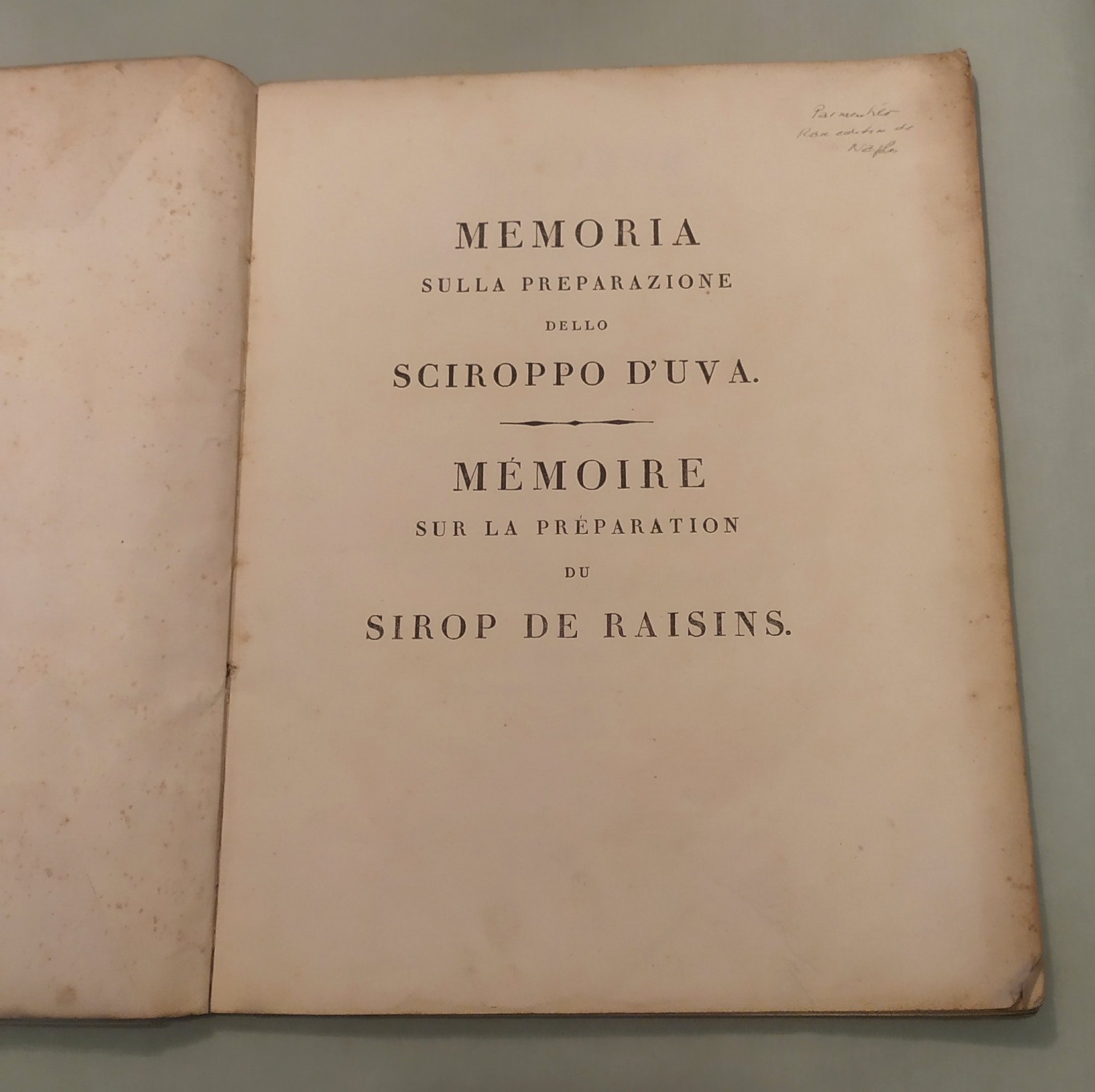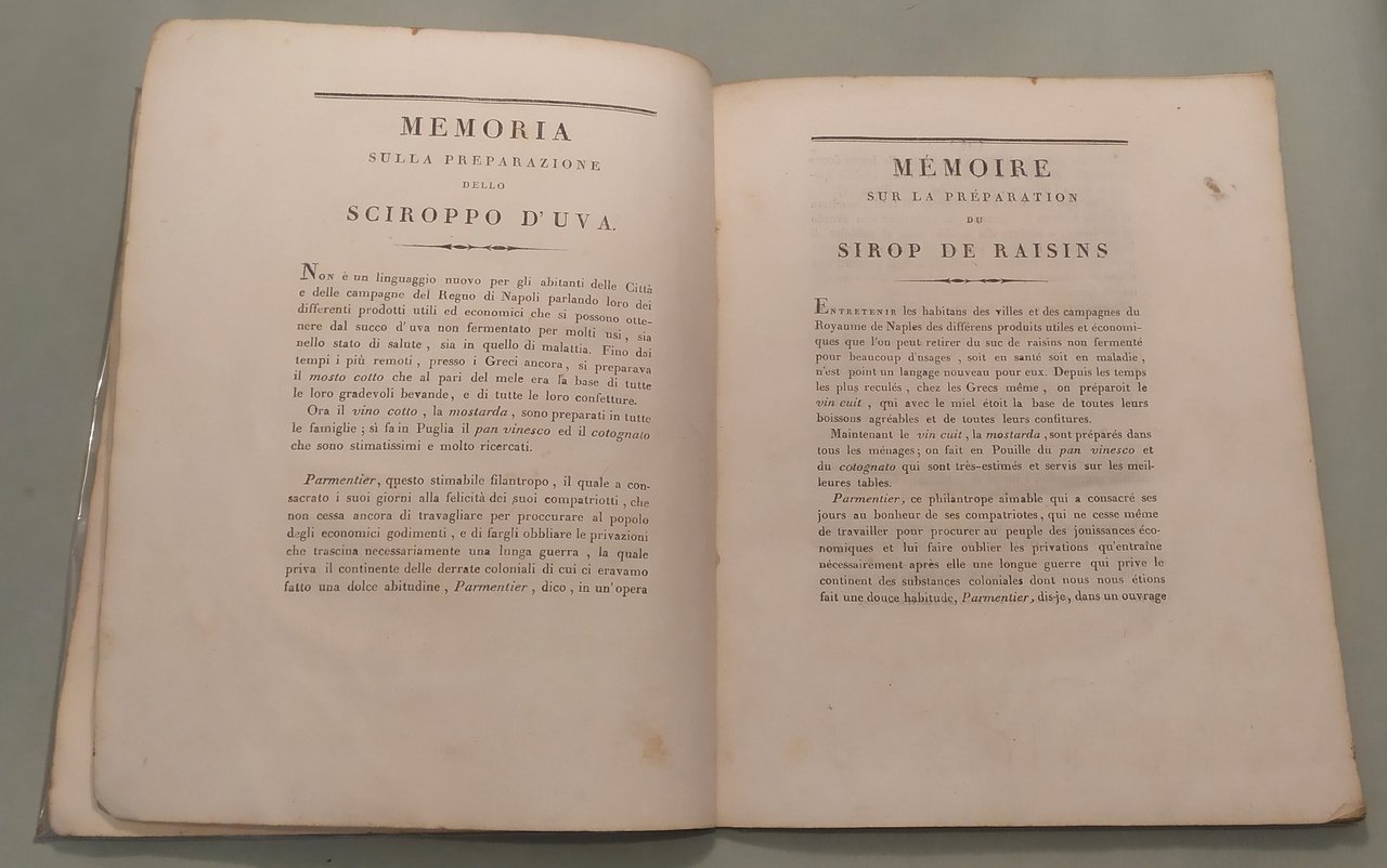 SAXE J.V. Memoria sulla preparazione dello sciroppo d'uva secondo le istruzioni del Signor Parmentier. con varie esperienze dell'autore. A Napoli, dalla Stamperia Francese, 1810. In 8vo; pp.53. Bross. coeva. Margini ampli. Testo francese a fronte. L'autore fu farmacista in capo dell'esercito e volle far conoscere nel Regno da poco conquistato alcune delle teorie enogastronomiche di Parmentier non tralasciando però di valorizzare e pubblicizzare alcuni prodotti locali derivati dallo sciroppo d'uva. Assai raro. Paleari, 1810. Non è citata quest'opera ne' da Vicaire ne' da Bitting.