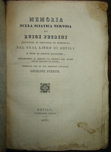 Memoria sulla sciatica nervosa di Luigi Petrini professore di chirurgia ed ostetricia nel Real Liceo di Aquila. rettificando il metodo di curarla col mezzo della ustione al piede.