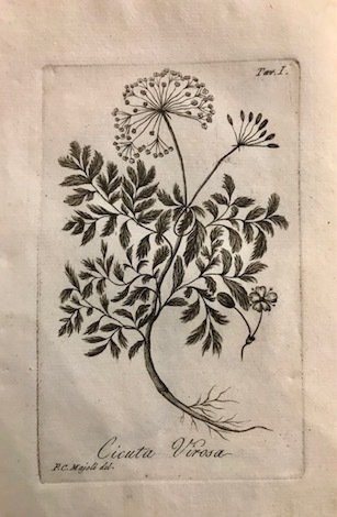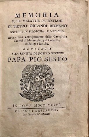 8vo (cm. 20), 188 pp., 2 cc.nn. bianche. Da p. 179 sono presenti ‘Annotazioni fitologiche delle principali piante velenose nocive ai bestiami.’ con 15 tavv. incise su rame f.t. (da disegni di P.C. Majoli). Stemma papale in xilografia al frontespizio. Fregi e capilettera n.t. Cartonato coevo alla rustica. Tagli colorati. Esemplare in eccellente stato di conservazione. Rara edizione originale. Blake, p. 333.