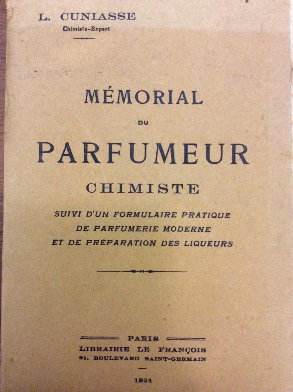 In-16 gr., brossura editoriale, pp. 347, con alc. figure nel testo Come si legge nell'introduz.: Le Mémorial du chimiste parfumeur pourrait aussi s'appeler le Mémorial des chimistes de distillerie, de droguerie. Il peut sevir aux pharmaciens et à toutes les personnes que l'étude des produits qui contiennent de l'alcool et des essences intéresse.. Nous donnons un grand développement à l'étude des produits synthétiques très employés dans la parfumerie moderne.. Enfin un formulaire pratique permettra de se rendre compte de la composition approximative des produits fabriqués que l'on rencontre actuellement dans le commerce. Esemplare fiorito.