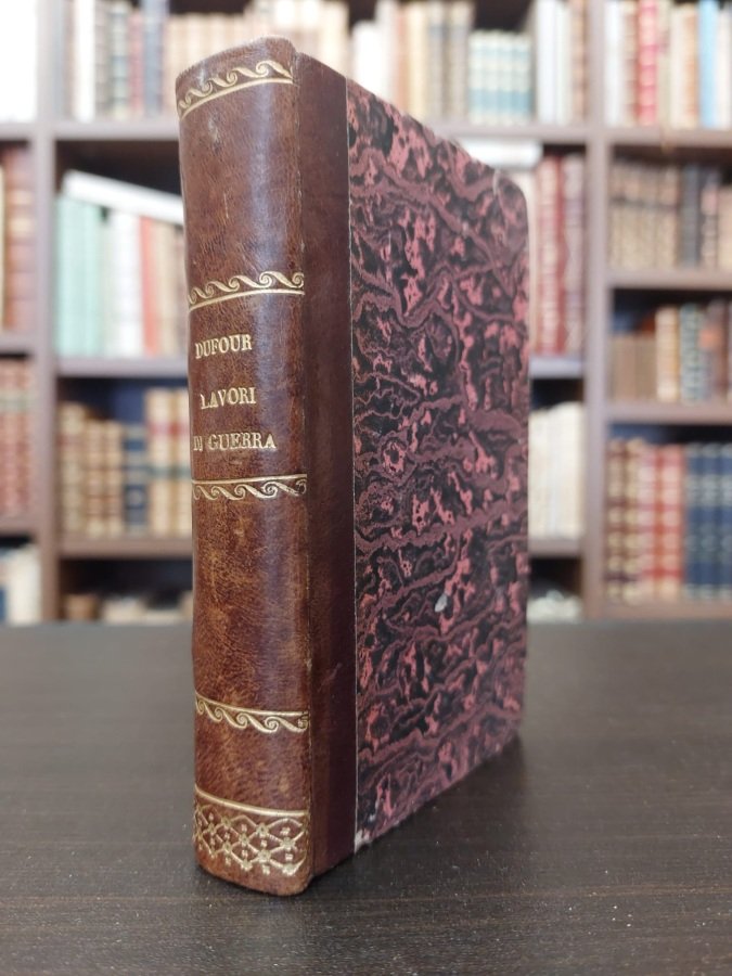 In-24° (cm. 12,6), legatura coeva in mezza pelle con titolo e fregi in oro al dorso (lievissime tracce d'uso), tagli spruzzati blu; pp. 403 [1b] in ottimo stato (minime e rare fioriture); con 15 tavole più volte ripiegate fuori testo in fine. Interessante opera sulle fortificazioni, trincee e opere di difesa del generale Dufour, presentato come Antico Ufficiale del Genio alunno della Scuola Politecnica e Commendatore delle Legion d'Onore. Collana «Biblioteca Militare per la Gioventù Italiana che si dedica alle Armi». Esemplare molto buono. (NQ6)