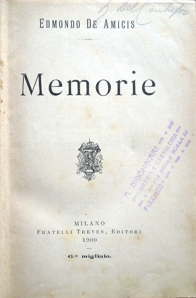 In-16° (18 x 11,8 cm), pp. (4), 407, (5), legatura coeva in mezza percallina, con titoli e filetti in oro al dorso. Normali segni d'uso e del tempo alla legatura. All'occhietto, arrossature e segni d'umido. Al frontespizio, timbro "A. Bigongiari - Libreria e Cartoleria - Via della Scala 33 - Firenze". Firma d'appartenenza nel bordo superiore del frontespizio e nella parte superiore di pagina 3. Qualche leggero segno d'umido e normale patina del tempo alle pagine, per il resto, ben conservato. Indice: Memorie giovanili. Garibaldino fallito; La capitale d'Italia nel 1863. Memorie di viaggiatori e d'artisti. Carlo Piaggia; Il capitano Bove; Un poeta vernacolo; Ulisse il Sanguinario; Casimiro Teja; Una visita a Jules Verne; Una visita a Vittoriano Sardou; Come nacque un poeta. Memorie d'oltralpe e d'oltremare. Sul lago di Ginevra; Nella Pampa Argentina; Nella baia di Rio Janeiro. Memorie sacre. In memoria di mia madre; In tua memoria, figlio mio!.