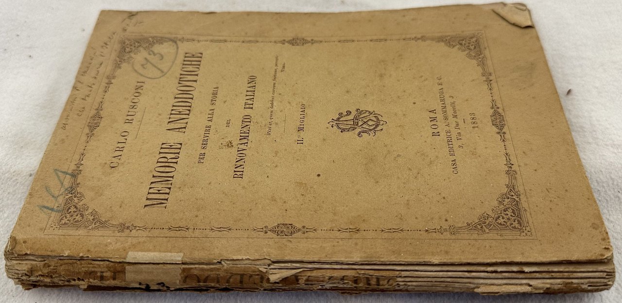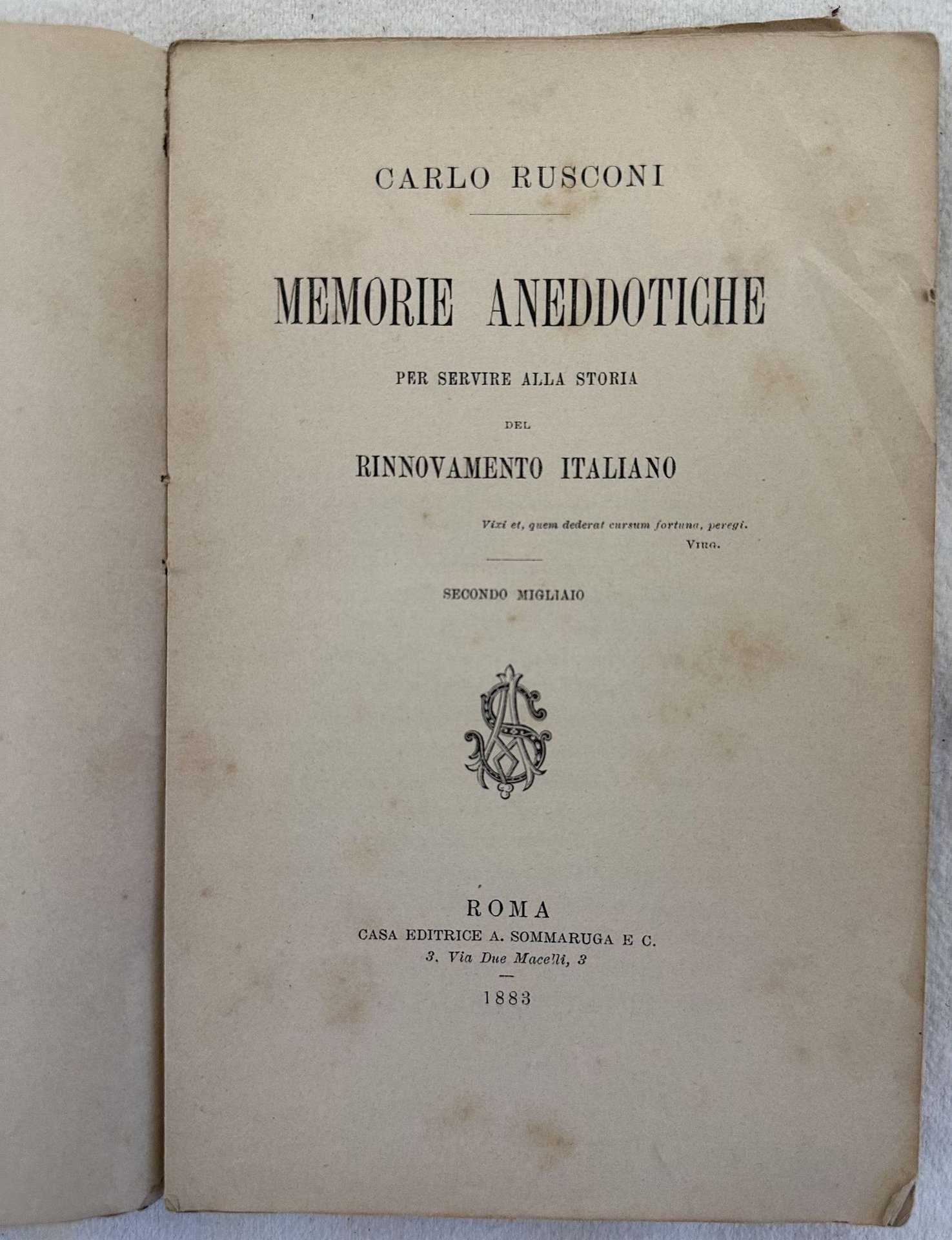 Prima edizione del 1883, secondo migliaio, di questa opera sul Risorgimento scritta da Carlo Rusconi. Dedica dell'autore in copertina al Ministro Pasquale Stanislao Mancini (Castel Baronia 1817- Napoli 1888) avvocato, giurista e politico. Tra gli argomenti trattati: La rivoluzione di Bologna del 1831, Giovanni Vicini, Paolo Costa, Bonelli, Tognetti e Modena, Il Generale Armandi, Mazzini e Buonarroti, Minghetti, Balbo, Niccolini, Il Cardinale Antonelli, Guerrazzi, Il padre Ventura, Novara e il Ministro degli esteri a Roima, Lorenzo Valerio, Lord Minto, Lord Beaumont, Riccardo Cobden, Pittore Morelli, Ledru Rollin, Frapolli, Montanelli, Madama Sand, Vescovo di Worcester, Lord Darnley, Macon e il poeta Lamartine, Felcie Orsini, Torino, Pier Dionigi Pinelli, Alberto Mario, Aleardo Aleardi, Pietro Maestri, Carlo Mayr, Salvatore Anau, Mauro Macchi, Il General Medici, Costantino Cernuschi, Agostino Bertant, Il Dottor Conenau, il banchetto della via di Lilla, Arago Girardin Carnot Favre Beranger Quinet Blanc, Il Principe Napoleone Girolamo ec. In discrete condizioni. Copertina editoriale in discrete condizioni generali con lievi usure ai margini e dorso. Piatto posteriore staccato. Legatura in discrete condizioni. All'interno le pagine si presentano in buone condizioni con fioriture. In 16. Dim. 18,5x12,5 cm. Pp. 155+(5).First edition of 1883, second thousand, of this work about Risorgimento period written by Carlo Rusconi. Dedication of the author in the cover to the Ministery Pasquale Stanislao Mancini (Castel Baronia 1817- Napoli 1888) lawyer jurist and politician. The issues treated: La rivoluzione di Bologna del 1831, Giovanni Vicini, Paolo Costa, Bonelli, Tognetti e Modena, Il Generale Armandi, Mazzini e Buonarroti, Minghetti, Balbo, Niccolini, Il Cardinale Antonelli, Guerrazzi, Il padre Ventura, Novara e il Ministro degli esteri a Roima, Lorenzo Valerio, Lord Minto, Lord Beaumont, Riccardo Cobden, Pittore Morelli, Ledru Rollin, Frapolli, Montanelli, Madama Sand, Vescovo di Worcester, Lord Darnley, Macon e il poeta Lamartine, Felcie Orsini, Torino, Pier Dionigi Pinelli, Alberto Mario, Aleardo Aleardi, Pietro Maestri, Carlo Mayr, Salvatore Anau, Mauro Macchi, Il General Medici, Costantino Cernuschi, Agostino Bertant, Il Dottor Conenau, il banchetto della via di Lilla, Arago Girardin Carnot Favre Beranger Quinet Blanc, Il Principe Napoleone Girolamo ec. In fair conditions. Editorial cover in fair general conditions lightly worn in the extremities. Back plate is detached. Binding in fair conditions. Inside pages are in good conditions with foxing. In 16. Dim. 18,5x12,5 cm. Pp. 155+(5).<BR><BR>