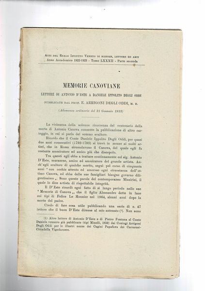 Memorie canoviane. Lettere di Antonio D'Este a Daniele Ippolito degli Oddi. Estratto dagli Atti del Reale Istituto Veneto di scienze lettere e arti del 1922-1923.