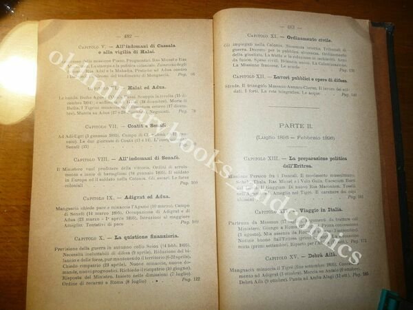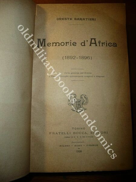 "DESCRIZIONE: Fratelli Bocca Torino 1898, ril. d'epoca tit. al dorso, pp. 487 in 16°. L'Opera contiene sei carte fuori testo: quattro raffigurano rispettivamente Agordat, Cassala, Coatit - Senafe e la Regione tra Sauria e Adua, e in fine due grandi carte, la seconda delle quali colori, raffiguranti "Da Sauria ad Adua" (formato cm.29,3x43, in scala 1:50.000), e "Carta generale della Colonia Eritrea MANCANTE (formato cm.56x60, in scala 1:1.000.000). Prima edizione delle memorie delle operazioni militari condotte in Etiopia ed Eritrea dal noto generale trentino, dal 1891 comandante in capo delle truppe italiane in Africa e dal 1892 Governatore dell'Eritrea, pubblicate dopo che egli non aveva potuto evitare l'umiliante disfatta italiana ad Adua nel 1896 (disfatta che condusse all'arresto del Baratieri e al suo conseguente processo ad Asmara). La presente opera vuole appunto essere giustificativa del proprio operato militare nelle campagne coloniali eritree. "Il disastro per l'esercito italiano fu grave; la perdita di prestigio, enorme. Gravi e profonde furono le reazioni in Italia, e tali da portare alle dimissioni di Crispi. Il successore Di Rudinì lasciò continuare la guerra al generale Baldissera, mentre il Baratieri veniva deferito, nel giugno 1896, al tribunale militare di Asmara per omissioni, negligenze, abbandono di comando in guerra. Prosciolto per inesistenza di reato, il Baratieri fu collocato a riposo su sua domanda, nello stesso 1896, e abbandonò la carriera militare. Ritiratosi nel Trentino, visse soprattutto ad Arco (Trento), occupandosi di studi e di beneficenza, e redigendo le proprie Memorie d'Africa (1892 - 1896), Torino 1898, in cui, con dovizia di particolari, ricostruiva la storia della sua permanenza in Africa." CONDIZIONI: Accettabili/Discrete legatura staccata come da foto. Tracce d'uso. PESO / WEIGHT: 600 gr. without package"