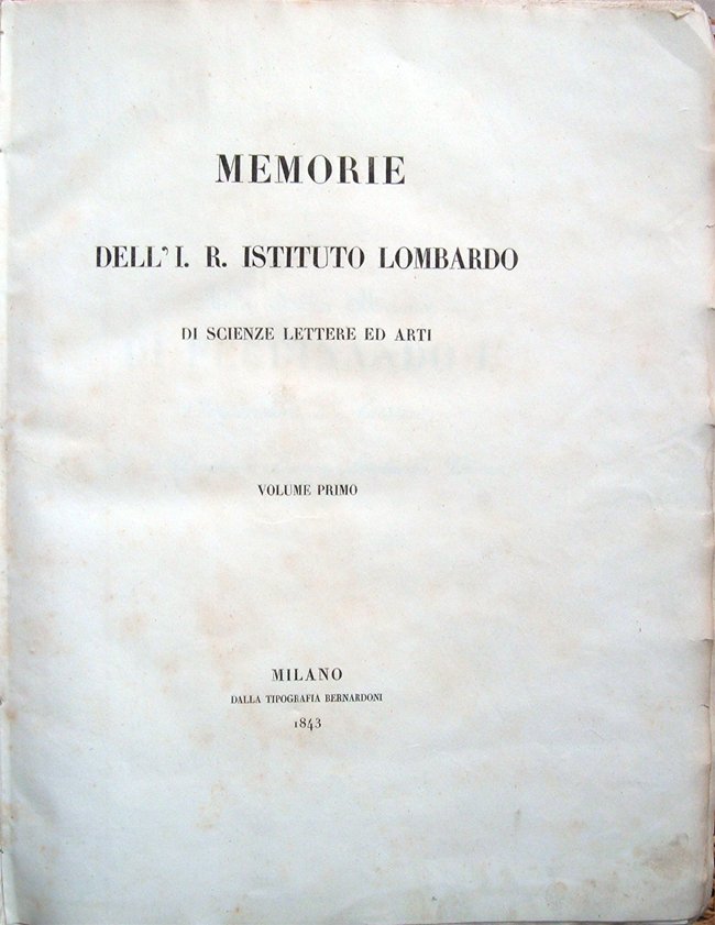 In-4° (cm 32,5x24,5), pp. XVIII, (2), 472, (4), legatura cartonata editoriale con vignetta entro cornice al piatto anteriore e titoli al dorso, con evidenti segni d'uso e del tempo (in particolare segni di abrasione lungo i bordi dei piatti, che determinano, in molti punti, mancanze, e aloni d'umido ai piatti e al dorso). Con due tavole incise su rame fuori testo. Alcuni leggeri aloni d'umido al margine inferiore di qualche pagina. A pagina 213, alcune piccole macchie di colore marrone nel testo: le macchie in questione non pregiudicano assolutamente la leggibilità del testo in quanto le lettere da esse interessate rimangono ben distinguibili. Interno dunque, nel complesso, in stato di conservazione molto buono. Pubblicazione su carta forte. Non comune. Nota di spedizione: il volume supera i 2 chilogrammi di peso. Oltre a contenere l'Elenco dei Membri attuali dell'I. R. Istituto Lombardo, il volume ospita le memorie: Giovanni Labus, Antica romana via del Sempione nuovamente osservata ed illustrata con monumenti contemporanei, con due tavole fuori testo: la prima raffigurante un'epigrafe scolpita su un masso "presso la via che dal borgo di Vogogna conduce al ponte della Masone" e l'ara di Fontanetto, la seconda ospitante una cartina della Valle Ossola (come ricordato, incisa su rame, cm 28,5x20,5 alla battuta), molto dettagliata, con indicazione di centri abitati, fiumi, laghi, monti, ecc. (tra i centri indicati segnaliamo, tra gli altri, Domodossola, Creola, Pallanzeno, Piedimulera, Vogogna, Premosello, Cuzzago, Migiandone, Ornavasso, Megolo, Rumianca, Calasca, Castiglione, Antronapiana, San Lorenzo, Crodo), cartina che illustra i tracciati della vecchia e della nuova strada per il Sempione; Giovan Battista Fantonetti, Del giusto valore della cura morale nella pazzia e della migliore maniera di praticamente applicarla; Bartolomeo Catena, Sopra l'idealismo popolare nelle rappresentazioni religiose. Ragionamento primo; Giuseppe Saleri, Delle cagioni che tardarono la filosofia del diritto penale e di quelle che la fecero sorgere negli ultimi tempi; Antonio De Kramer, Ricerche per discoprire nel sangue, nell'urina, ed in varie alte secrezioni animali le combinazioni minerali somministrate per bocca; Bartolomeo Panizza, Dello assorbimento venoso; Antonio Bordoni, Sugli esami ossia sul merito di un esaminato; Gabrio Piola, Nuove ricerche per una risoluzione più rigorosa di vari problemi sul moto dell'acqua; Giulio Ferrario, Memorie per servire alla storia dell'architettura milanese dalla decadenza dell'Impero romano fino ai nostri giorni.