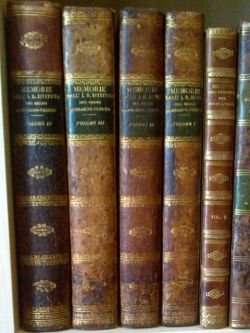 5 volumi in-4° (cm. 31), eleganti legature coeve in p. vitello maculato (restauri) con titolo su tassello e fregi in oro ai dorsi, piatti inquadrati in cornice floreale, tagli spruzzati, sguardie marmorizzate (legatura differente all'ultimo tomo in p. pelle con titolo e fregi in oro al dorso, piatti inquadrati in cornice romantica, tagli dorati); carta greve in ottimo stato, ad ampi margini e freschissima, con 17 tavole illustrative ripiegate f.t. nei primi tre tomi; antico Ex libris con monogramma impresso ai frontespizi, etichetta al primo contropiatto di libreria antiquaria del XX secolo. Raccolta in edizione originale di tutti i volumi delle memorie mediche e scientifiche dell'Istituto di Scienze Arti e Lettere del Regno Lombardo Veneto. Ogni volume contiene una breve notizia storica sull'Istituto, una serie di commemorazioni dei soci defunti raccolte da Francesco Carlini, un catalogo delle opere presentate in dono all'Istituto, una serie di articoli che illustrano le ultime scoperte nei rispettivi campi. Cfr. Catalogo Periodici Biblioteche lombarde, III, 271. Manca a Predari, Hoepli, Meneghina. Alquanto raro così completo. Ottimo esemplare. (SM4)