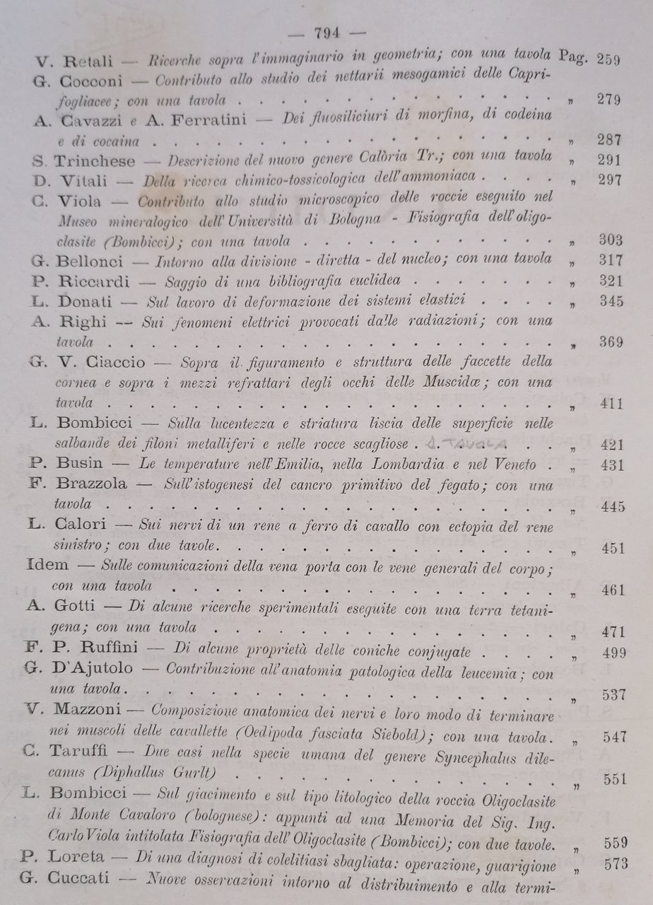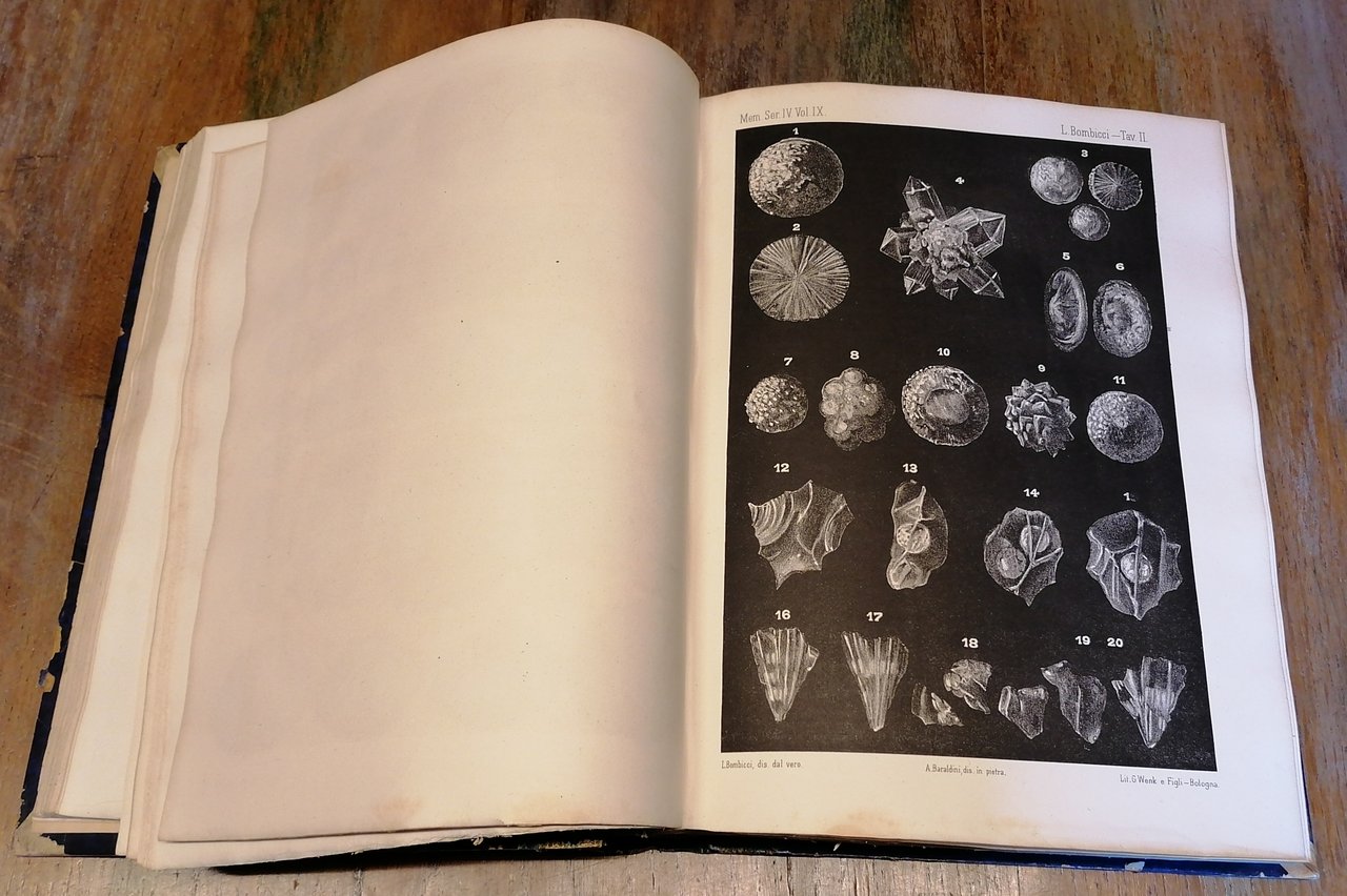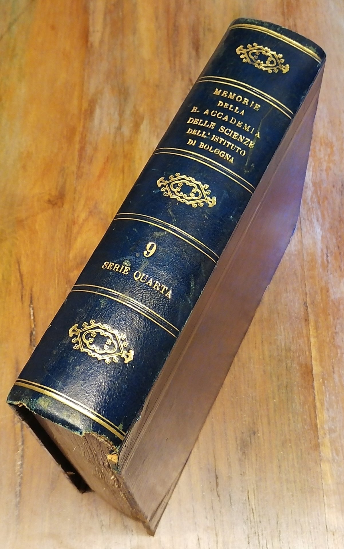 (Mineralogia - Medicina - Anatomia - Metereologia - Botanica - Fisica - Chimica - Matematica - Fisiologia animale - Entomologia) In 4°, legatura coeva in mezza pelle nera, al dorso titoli, filetti e fregi in oro, pp. 795,(1), con 33 tavole fuori testo di cui 5 a doppia pagina (una a colori), 2 a colori e 2 ripiegate. Il volume contiene memorie scientifiche dell'anno accademico 1887-88. Autori : Vincenzo Colucci, Salvatore Pincherle, GuidoTizzoni, Floriano Brazzola, Stefano Mircoli, Pietro Albertoni, Luigi Calori, Luigi Bombicci, Alfonso Poggi, Federico Delpino, Ferdinando Verardini, Giovanni Capellini, Virginio Retali, Girolamo Cocconi, Alfredo Cavazzi, Adolfo Ferratini, Salvatore Trinchese, Dioscoride Vitali, Carlo Viola, Giuseppe Bellonci, Pietro Riccardi, Luigi Donati, Augusto Righi, Giuseppe Vincenzo Ciaccio, Paolo Busin, Alfredo Gotti, Ferdinando Paolo Ruffini, Giovanni D'Ajutolo, Vittorio Mazzoni, Cesare Taruffi, Pietro Loreta, Giovanni Cuccati, Gian Pietro Piana, Fausto Morini, Geminiano Pirondini, Antonio Saporetti, Ivo Novi, Cesare Razzaboni, Sebastiano Giovannini, Amilcare Razzaboni, Giovanni Brugnoli. Ottimo stato di conservazione.