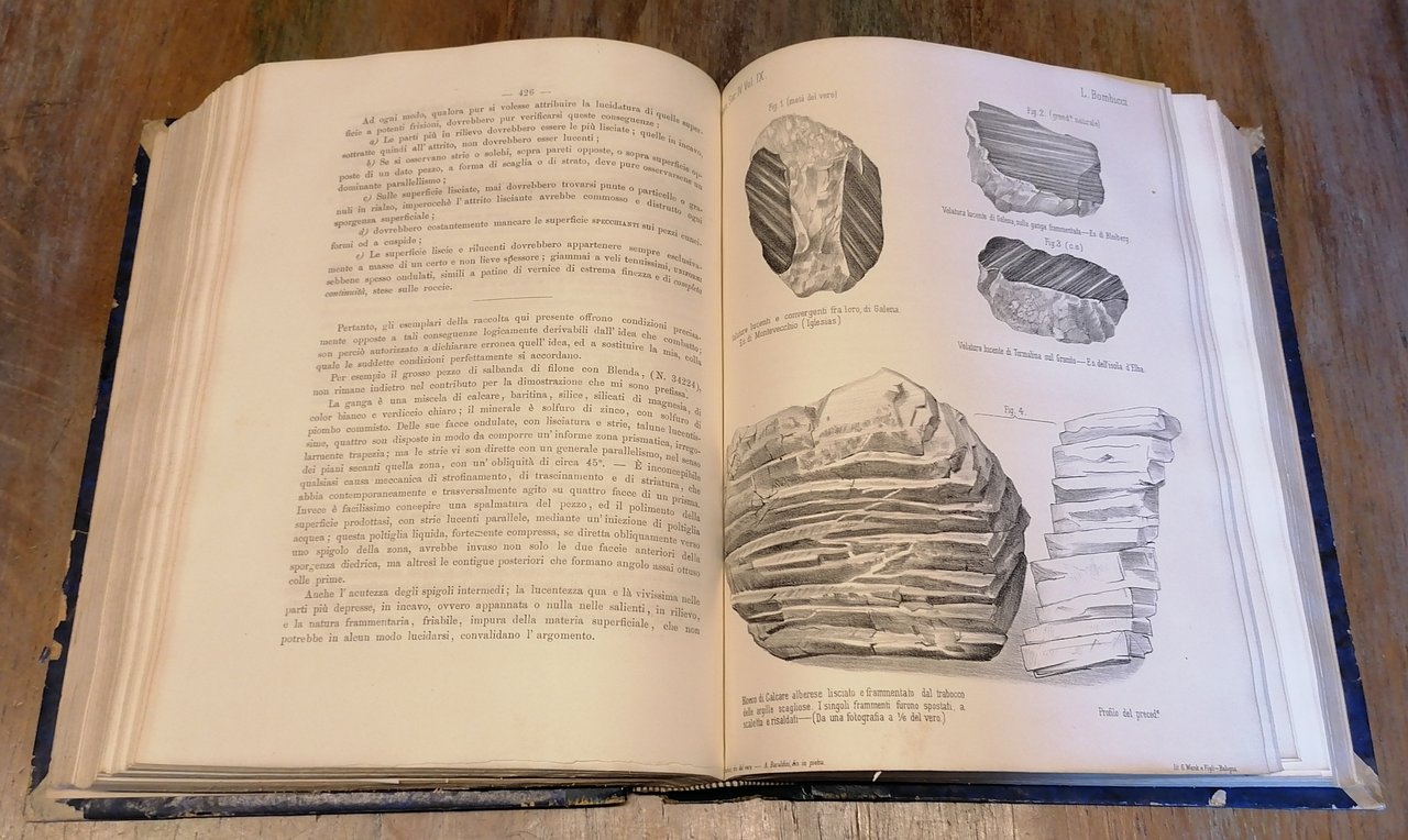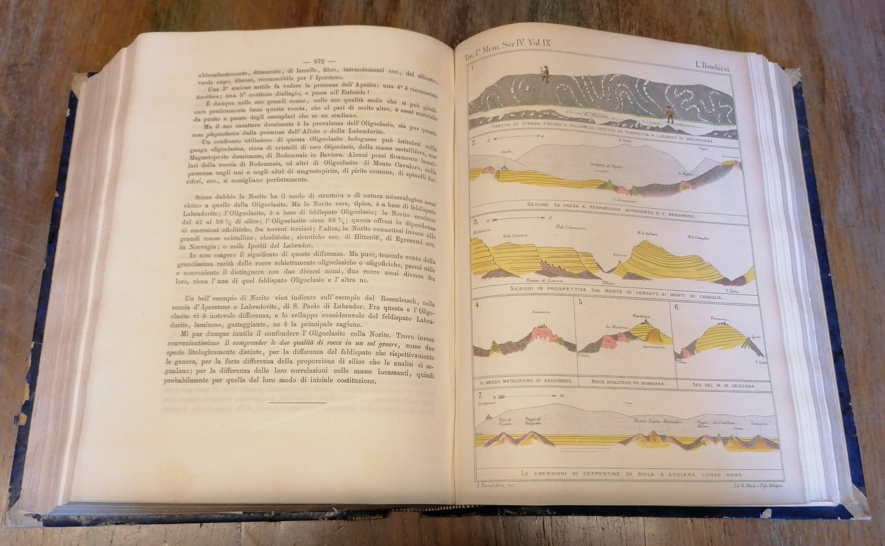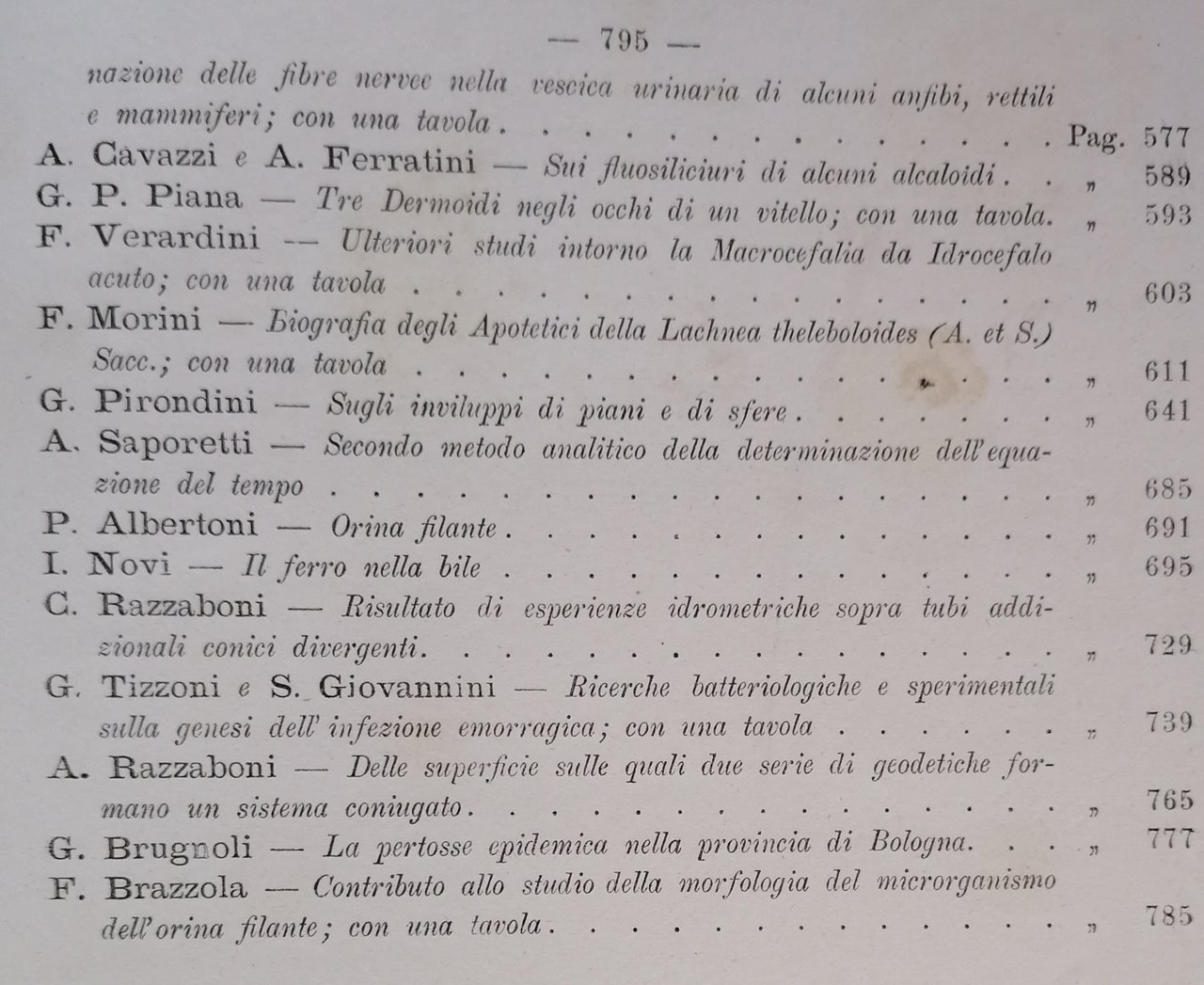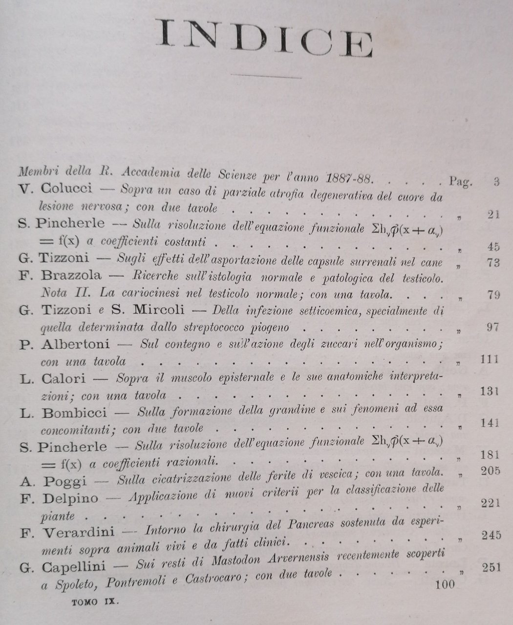 (Mineralogia - Medicina - Anatomia - Metereologia - Botanica - Fisica - Chimica - Matematica - Fisiologia animale - Entomologia) In 4°, legatura coeva in mezza pelle nera, al dorso titoli, filetti e fregi in oro, pp. 795,(1), con 33 tavole fuori testo di cui 5 a doppia pagina (una a colori), 2 a colori e 2 ripiegate. Il volume contiene memorie scientifiche dell'anno accademico 1887-88. Autori : Vincenzo Colucci, Salvatore Pincherle, GuidoTizzoni, Floriano Brazzola, Stefano Mircoli, Pietro Albertoni, Luigi Calori, Luigi Bombicci, Alfonso Poggi, Federico Delpino, Ferdinando Verardini, Giovanni Capellini, Virginio Retali, Girolamo Cocconi, Alfredo Cavazzi, Adolfo Ferratini, Salvatore Trinchese, Dioscoride Vitali, Carlo Viola, Giuseppe Bellonci, Pietro Riccardi, Luigi Donati, Augusto Righi, Giuseppe Vincenzo Ciaccio, Paolo Busin, Alfredo Gotti, Ferdinando Paolo Ruffini, Giovanni D'Ajutolo, Vittorio Mazzoni, Cesare Taruffi, Pietro Loreta, Giovanni Cuccati, Gian Pietro Piana, Fausto Morini, Geminiano Pirondini, Antonio Saporetti, Ivo Novi, Cesare Razzaboni, Sebastiano Giovannini, Amilcare Razzaboni, Giovanni Brugnoli. Ottimo stato di conservazione.