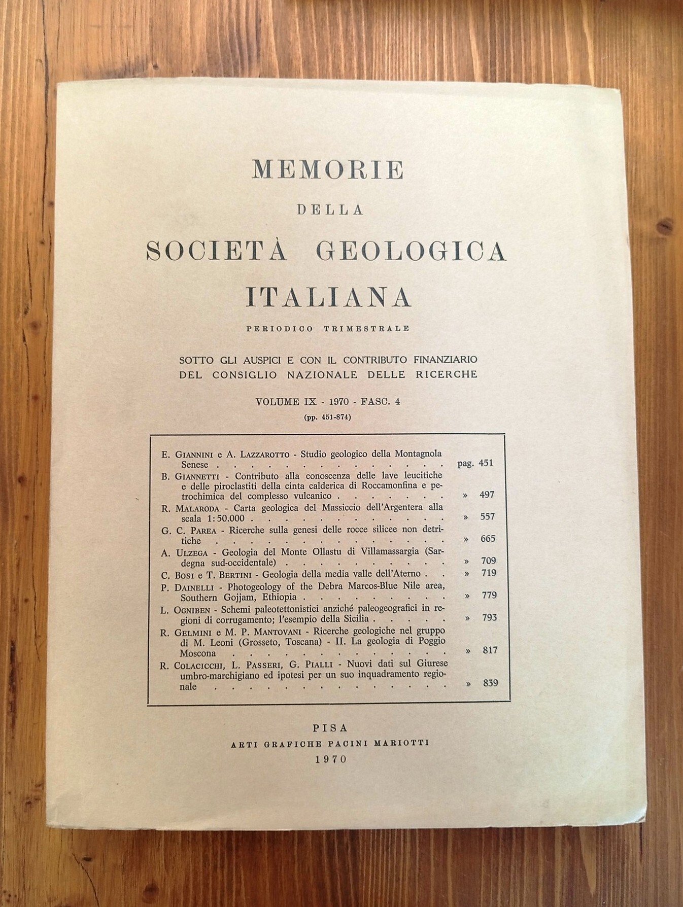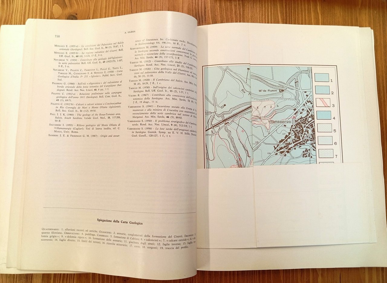 Brossura editoriale in grande formato (31 cm), pagine numerate da 451 a 874 con figure e grafici in nero a corredo del testo, alcune tavole e tabelle ripiegate; allegate in apposite tasche sei (6) carte a colori: Carta geologica della Montagnola Senese (prov. di Siena) - Carta geologica del Massiccio dell'Argentera + Schema dei rapporti stratigrafici. Legenda. Profili geologici - Carta geologica della Media Valle del Fiume Aterno - Photogeology of Debra Marcos - Blue Nile area: morphologic units + photogeological map. Ottimo esemplare di una pubblicazione non comune -- INDICE degli articoli: E. GIANNINI e A. LAZZAROTTO, Studio geologico della Montagnola Senese - B. GIANNETTI, Contributo alla conoscenza delle lave leucitiche e delle piroclastiti della cinta calderica di Roccamonfina e petrochimica del complesso vulcanico - R. MALARODA, Carta geologica del Massiccio dell'Argentera alla scala 1 : 50.000 - G. C. PAREA, Ricerche sulla genesi delle rocce silicee non detritiche - A. ULZEGA, Geologia del Monte Ollastu di Villamassargia (Sardegna sud-occidentale) - C. BOSI e T. BERTINI, Geologia della media valle dell'Aterno - P. DAINELLI, Photogeology of the Debra Marcos - Blue Nile area, Southern Gojjam, Ethiopia - L. OGNIBEN, Schemi paleotettonistici anziché paleogeografici in regioni di corrugamento; l'esempio della Sicilia - R. GELMINI e M. P. MANTOVANI, Ricerche geologiche nel gruppo di Monte Leoni (Grosseto, Toscana); La geologia di Poggio Moscona - R. COLACICCHI, L. PASSERI e G. PIALLI, Nuovi dati sul Giurese umbro-marchigiano ed ipotesi per un suo inquadramento regionale