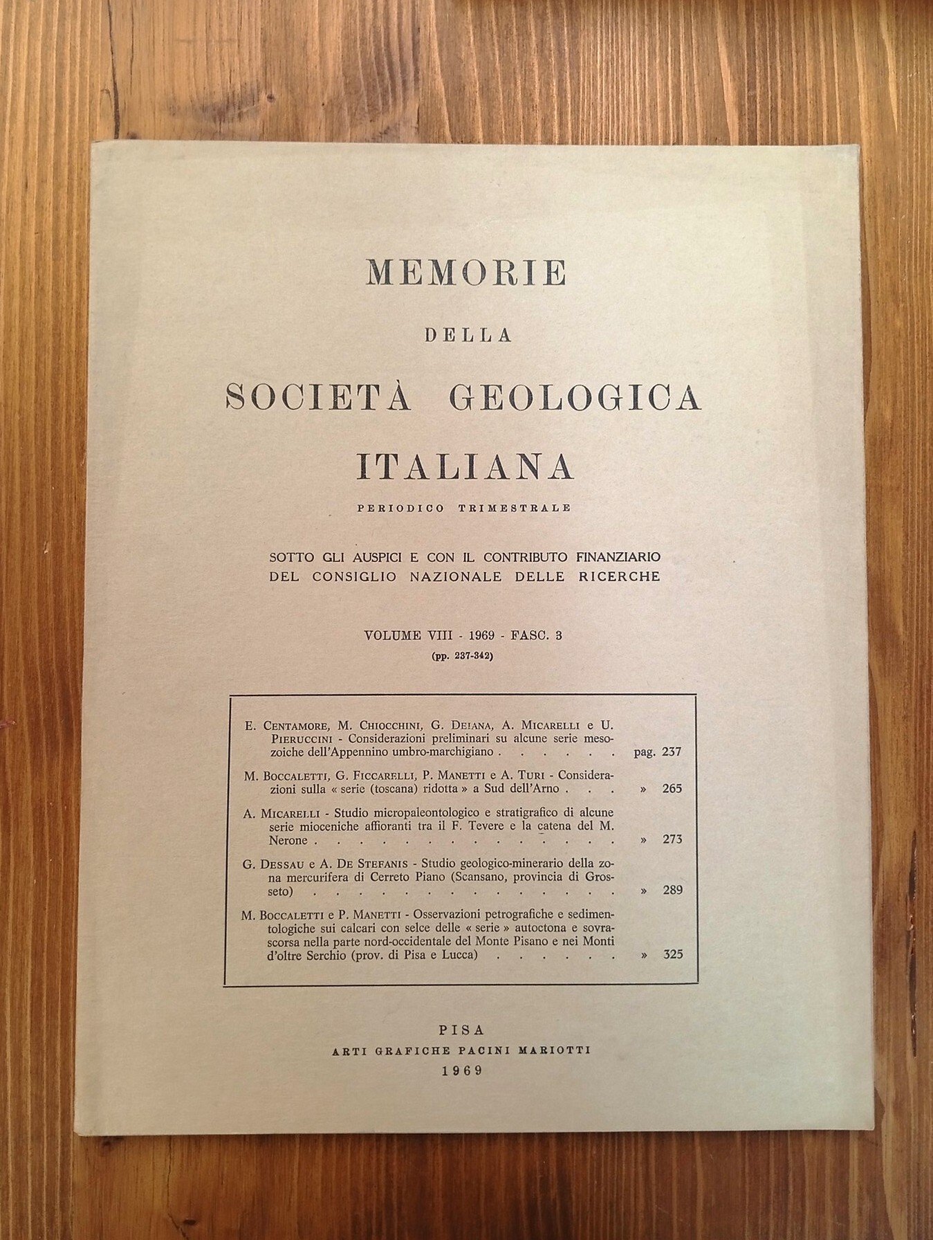 Brossura editoriale in grande formato (31 cm), pagine numerate da 237 a 342 con figure e grafici in nero a corredo del testo e 3 tavole ripiegate fuori testo. Ottimo esemplare di una pubblicazione non comune -- INDICE degli articoli: E. CENTAMORE, M. CIOCCHINI, G. DEIANA, A. MICARELLI e U. PIERUCCINI, Considerazioni preliminari su alcune serie mesozoiche dell'Appennino umbro-marchigiano - M. BOCCALETTI, G. FICCARELLI, P. MANETTI e A. TURI, Considerazioni sulla "serie (toscana) ridotta" a Sud dell'Arno - A. MICARELLI, Studio micropaleontologico e stratigrafico di alcune serie mioceniche affioranti tra il Fiume Tevere e la catena del Monte Nerone - G. DESSAU e A. DE STEFANIS, Studio geologico-minerario della zona mercurifera di Cerreto Piano (Scansano, provincia di Grosseto) - M. BOCCALETTI e P. MANETTI, Osservazioni petrografiche e sedimentologiche sui calcari con selce della "serie" autoctona e sovrascorsa nella parte nord-occidentale del Monte Pisano e nei Monti d'oltre Serchio (prov. di Pisa e Lucca)