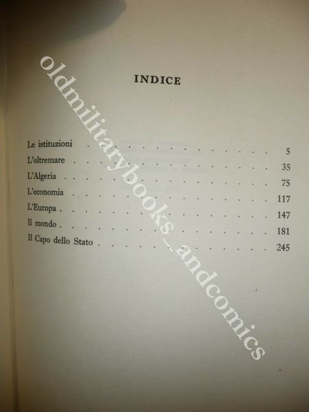 DESCRIZIONE: Rizzoli Milano 1970 II^ Ed., br. ed. ca. tit. al tassello con sovracc. ill., pp. 273 in 8°. I momenti cruciali del periodo in cui il Generale prese il potere nella Francia in crisi, le istituzioni, l'Oltremare, l'Algeria, i rapporti con l'Europa e il mondo, ecc. CONDIZIONI: Ottime. PESO / WEIGHT: 600 gr. without package