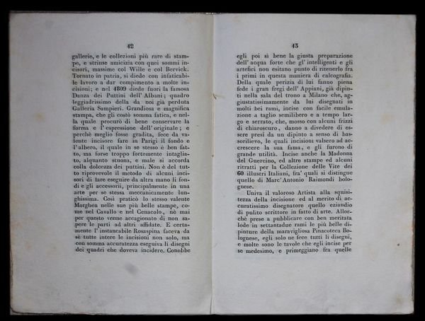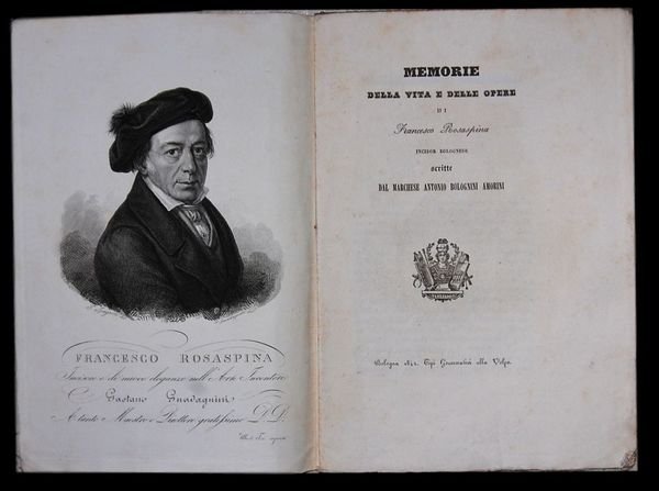 In 8° (22×15,5 cm); 21, (1) pp. e una c. di tav. con bel ritratto del Rosaspina inciso da Uberto Tosi. Brossura editoriale con ricca cornice ai piatti. Esemplare ancora in barbe ed in buone-ottime condizioni di conservazione. Prima edizione di questa biografia del celebre incisore Francesco Rosaspina (Montescudo in provincia di Rimini, 1762 Bologna, 1841) famoso per le riproduzioni dei quadri del Parmigianino e del Correggio, dei maggiori del Seicento bolognese, opere di Andrea Appiani e del Settecento europeo. Grande amico di Andrea Appiani e di Giovanni Battista Bodoni fu docente allAccademia Clementina. Lautore dello scritto, il Marchese Antonio Bolognini Amorini (Bologna, 7 febbraio 1767 Bologna, 18 giugno 1845), fu valente scrittore e storico e a lui si devono varie biografie dedicate a celebri artisti bolognesi come Dentone, Mitelli, Primaticcio, Albani, Reni, Domenichino, Guercino e i Carracci elaborati come continuazione della Felsina Pittrice del Malvasia. Prima edizione in buone-ottime condizioni di conservazione. Rif. Bibl.: IT\ICCU\RAV\0251936.