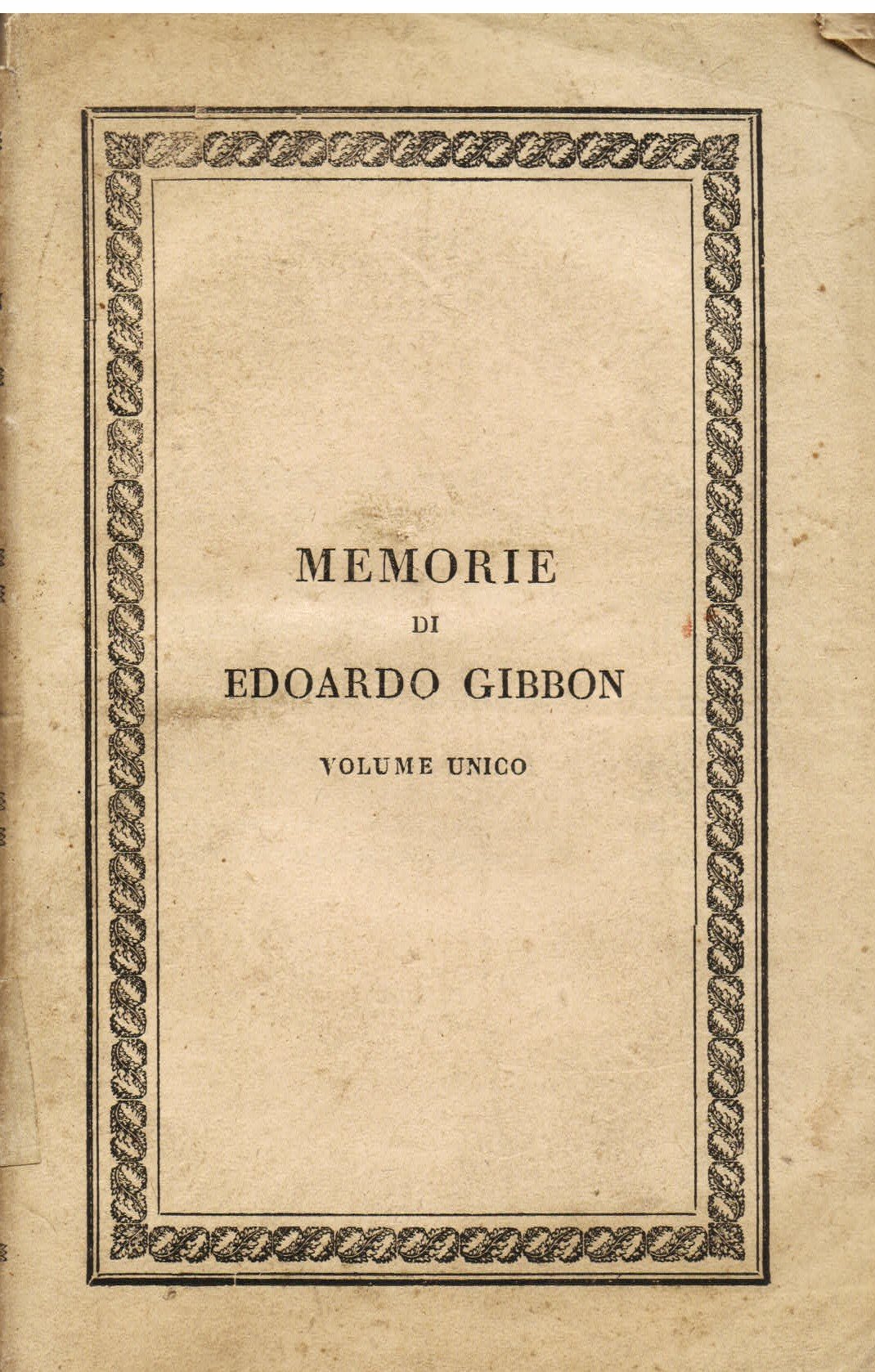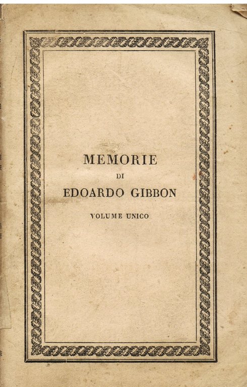 In-8°, pp. XXVI, 231, brossura editoriale con titolo entro bordura ornamentale. Bell'esemplare in barbe. Prima edizione italiana delle memorie autobiografiche del massimo storico del XVIII secolo, autore della fondamentale 'The History of the Decline and Fall of the Roman Empire', fra i capidopera della storiografia di ogni tempo. Le pp. in nn. romani riproducono la prefazione dell'editore e traduttore francese. 'Vite di uomini illustri scritte da loro medesimi'.