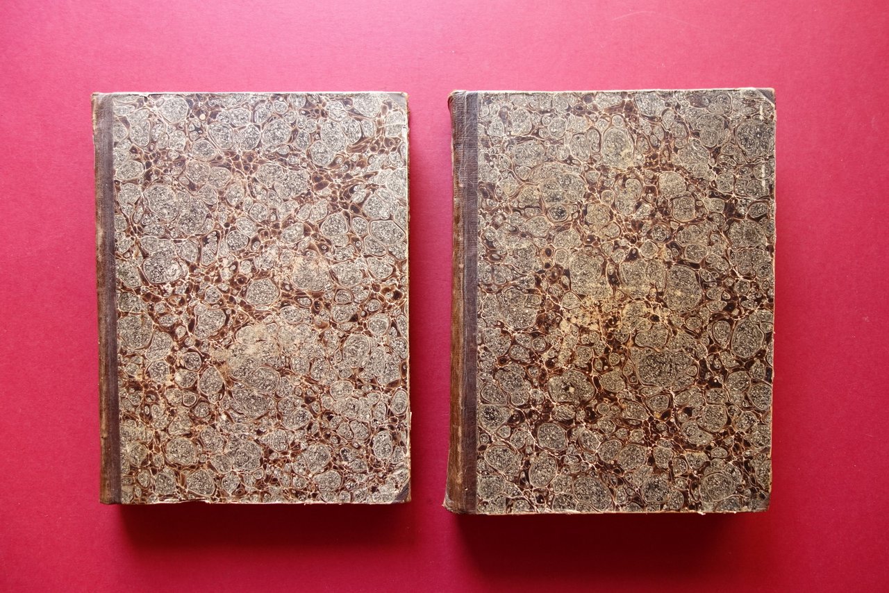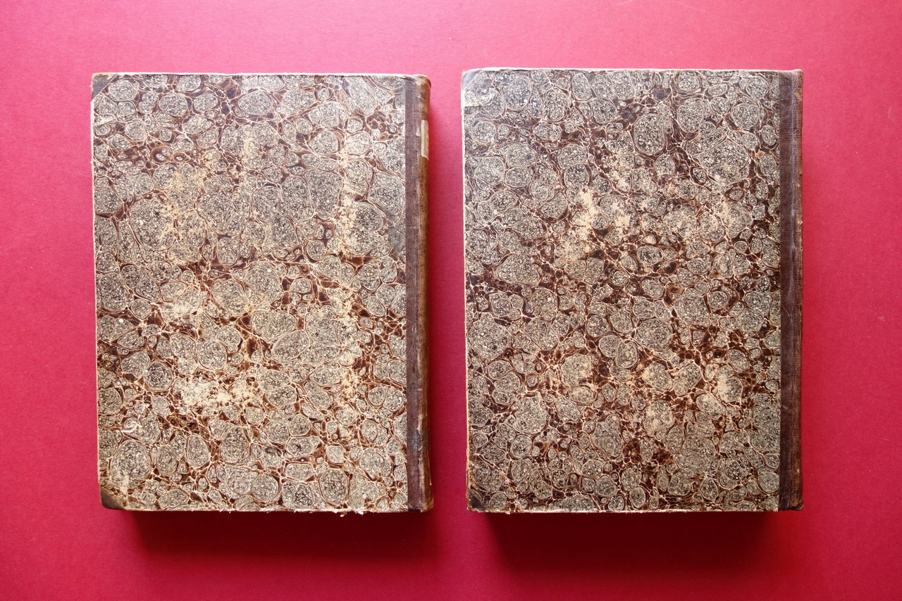 Arciprete Camillo Acquacotta, Memorie di Matelica raccolte ed ordinate dall'Arciprete Camillo Acquacotta *** Lapidi e documenti alle Memorie di Matelica raccolte ed ordinate dall'Arciprete Camillo Acquacotta Tip. Baluffi, Ancona 1838-39; cm 28x21; pp. VIII-224-[10] con qualche epigrafe xilografica nel t., più una grande albero genealogico della famiglia Conti Ottoni rip. più volte (vol. memorie); pp. 360 con alcune riproduzioni di lapidi, più una tavola genealogica della famiglia Pellegrini rip. al termine del testo (vol. lapidi e documenti); entrambi i volumi con marca tip. incisa in b/n al frontespizio. Pregevole legatura d'epoca in mezza pelle (dorso e angoli), con titolo annotato a mano entro etichetta applicata al dorso; tagli colorati a spruzzo. Opera completa in due volumi. Condizioni di conservazione Volumi entrambi in buone condizioni con leggere tracce d'uso, coperte con alcune minime abrasioni prevalentemente ai margini dei piatti. Interni buoni, marginosi, con qualche piccola lieve brunitura. Angolo inf. destro del frontespizio e delle pp. 1-252 del volume lapidi e documenti con un piccolo camminamento da tarlo, che si riduce gradualmente a due minimi forellini, senza alcuna perdita di testo (vedi foto). Rara edizione originale dell'opera storica sulla suddetta località delle Marche. Opera completa in due volumi, quello di testo e quello relativo alle lapidi e documenti (vedi foto). Bella edizione, pregevolmente rilegata, ben conservata. SETT218.L20588 N