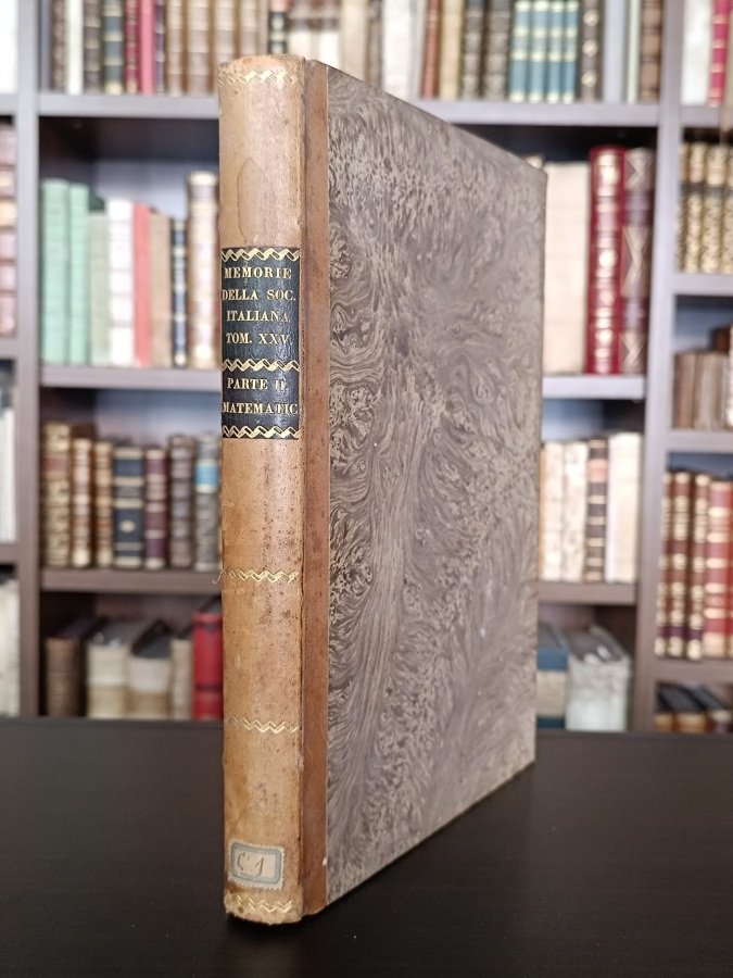 <span style="font-style: normal;">In-4° (cm. 28,8), legatura coeva in mezza pelle nocciola, dorso liscio con titolo in oro su tassello in bicromia e fregi sempre in oro (antica collocazione al piede, errore al tassello), piatti marmorizzati, tagli spruzzati in blu; pp. [4] 54 [2] 314 su carta greve, in ottimo stato (lievissime e sporadiche fioriture); con 2 tavole in rame più volte ripiegate fuori testo. Tra i saggi contenuti in questa Parte Prima del Tomo XXV: Relazione di una ordinazione di Archetipi e di Strumenti metrici data dal Governo di Modena in Parigi di Giuseppe BIANCHI (metrologia); </span><i>Procés verbal des opérations de vérification qui ont été faites sur les Instruments et sur les Etalons de misure métriques et pondéraux</i> di V. REGNAULT; Elenco di libri e opere offerte in dono alla Società nel biennio 1850-1851; Elenco de' più recenti lavori dei Membri Attuali della Società; Statuto della Società Italiana delle Scienze; Catalogo de' Membri componenti; Su le operazioni inverse dell'Aritmetica (matematica) di Gaspare MAINARDI; Di un facile problema di Geometria rimarcabile per la novità delle conseguenze; Tavola sinottica dei Generi spettante alla classe degli insetti artroindignati, Hémiptera, Linn. Latr. Rhyngota, Fab. Ryhyncota, Burm. (scienze naturali) di Massimiliano SPINOLA; Sull'eziologia della glucosuria (medicina) di Maurizio BUFALINI; Su due Libri di Apollonio Pergeo detti delle Inclinazioni e sulle diverse Restituzioni di essi (matematica) di Vincenzo FLAUTI; Sopra il fenomeno che si osserva nelle calamite temporarie di non cessar totalmente, né quasi totalmente, l'attrazione fra la calamita e l'ancora quando, al cessar della corrente nel filo conduttore avvolto alla calamita, si conserva l'ancora ad essa applicata di Pietro Domenico MARIANINI; Sulla insussistenza della Generazione spontanea di Giulio SANDRI. Non comune. Ottimo esemplare. (SA6)