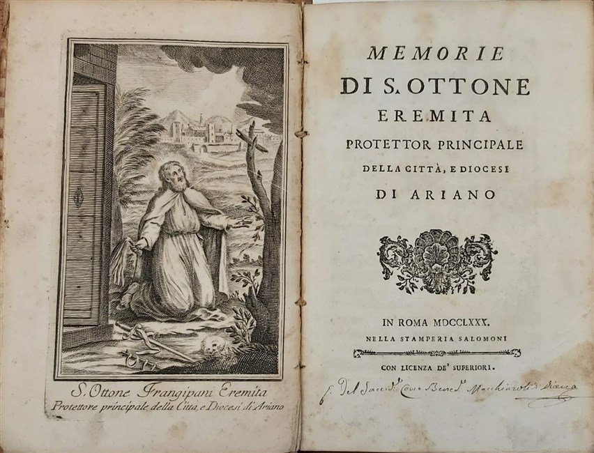 in-8, pp. 232, leg. cart. dec. coeva (manca la carta al d.). Antip.inc. in rame raff. il Santo. Fregio xilogr. al front. Non comune agiografia legata alla città di Ariano Irpino, nei pressi di Avellino, in cui si narrano le vicende di Ottone Frangipane, frate eremita vissuto nel XII sec. Melzi II, 183. Ex libris. [144]