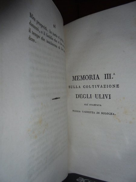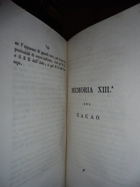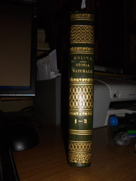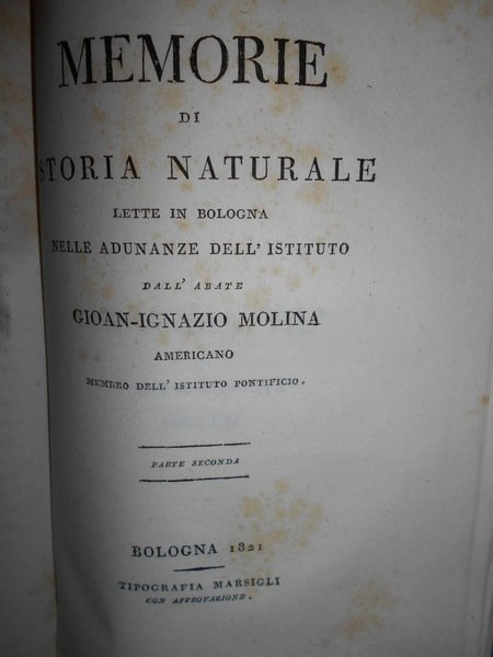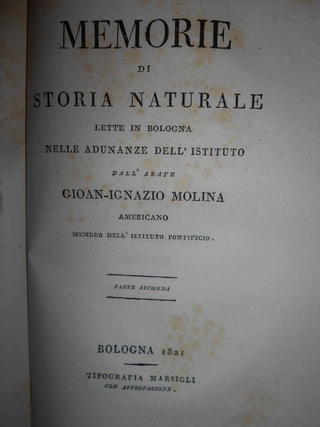 Gioan-Ignazio Molina. Bologna, Tip. Marsigli, 1821. MEMORIE di Storia Naturale lette in Bologna nelle adunanze dell' Istituto. In-8°, m. pelle coeva, fregi con titolo in oro al dorso. 251, (1) pp. CONTIENE 14 'MEMORIE' : SULLA PORRETTA. - OSSERVAZIONI SULLA FISICA COSTITUZIONE E SUI PRODOTTI MINERALI DELLA MONTAGNA BOLOGNESE - SULLA COLTIVAZIONE DEGLI ULIVI. - SULLE MARNE. - IL CAFFÉ. - ANALOGIE MENO OSSERVATE DEI TRE REGNI DELLA NATURA. - I GIARDINI INGLESI. - LE BALENE. - SULLA PROPAGAZIONE DEGLI ALBERI E SPECIALMENTE DEGLI ABETI. - SUL CARBONE. - SUL POTOSÌ MONTE ARGENTIFERO DEL PERÙ. - SULLA PROPAGAZIONE SUCCESSIVA DEL GENERE UMANO. - SUL CACAO. - SOPRA LO ZUCCHERO. Lievissime fioriture nel primo frontespizio e nelle ultime 3 pp. peraltro bell' esemplare. Neg. Bol. mob. 6 carc.