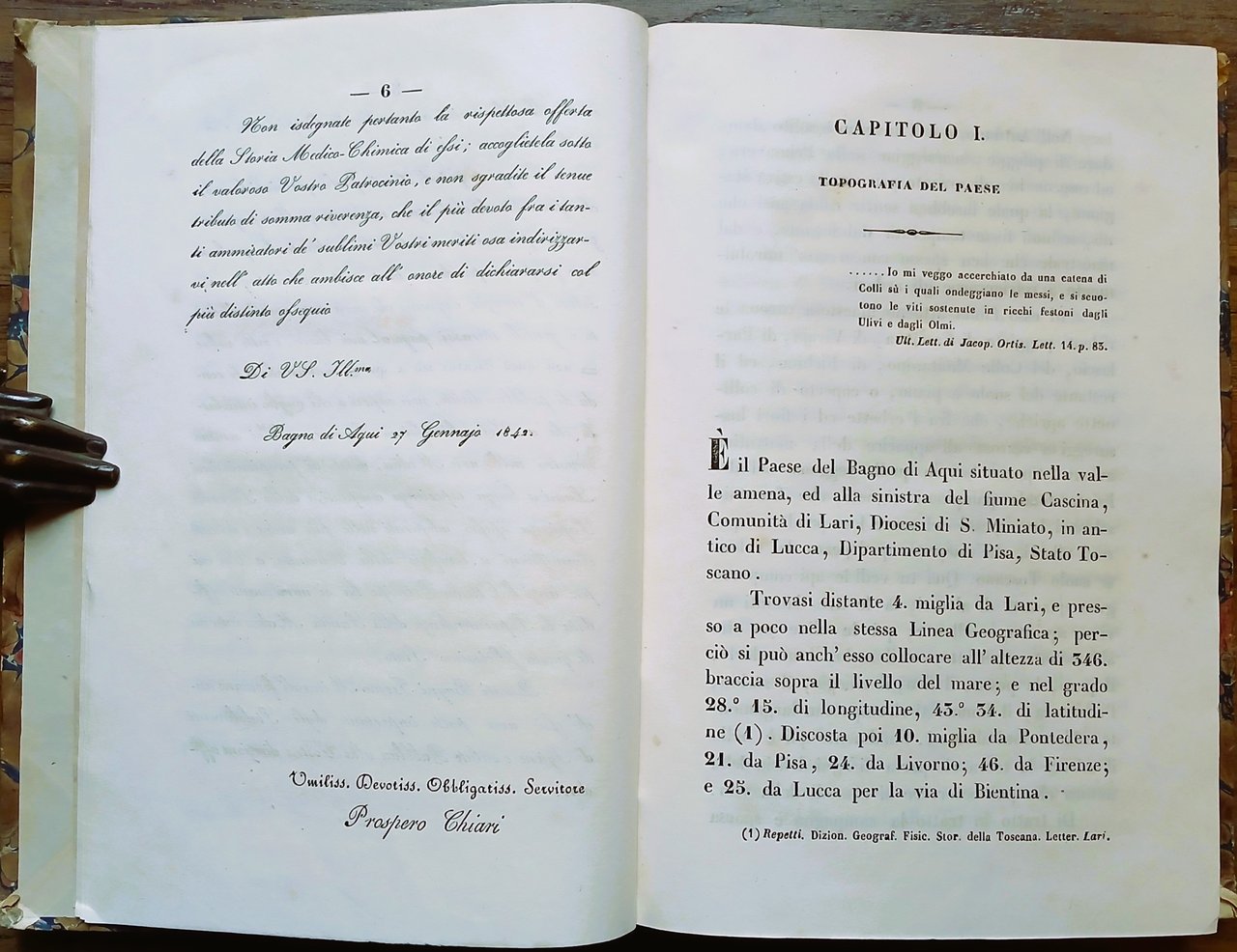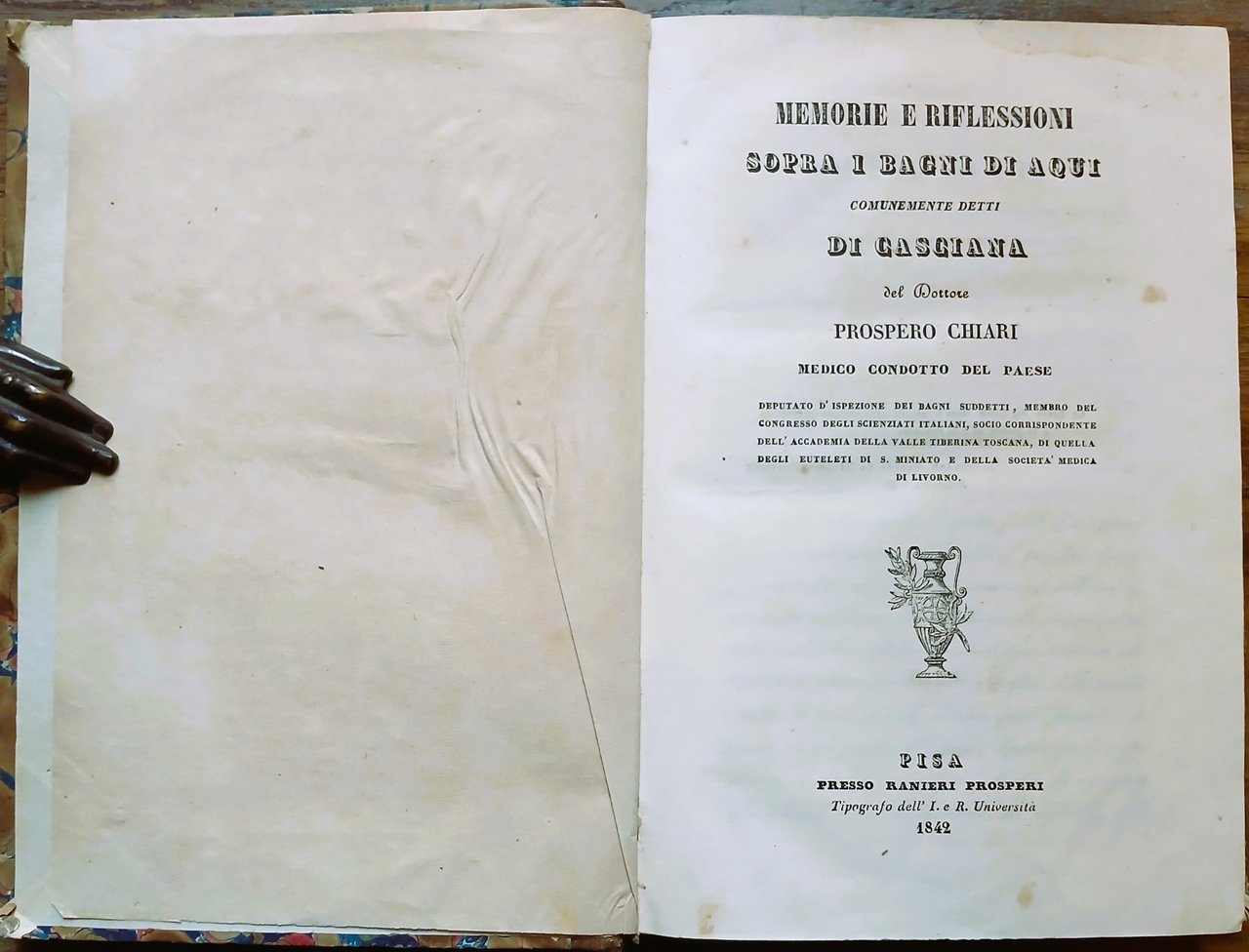 (Medicina termale; Toscana; Casciana Terme; Acque termali; Termalismo; Idrologia medica) In 8°, legatura coeva in mezza pelle con titoli ed impressioni in oro al dorso, carta marmorizzata ai piatti, pp. 263,(1). Leggere tracce del tempo alla legatura ma esemplare ben conservato. Edizione originale.