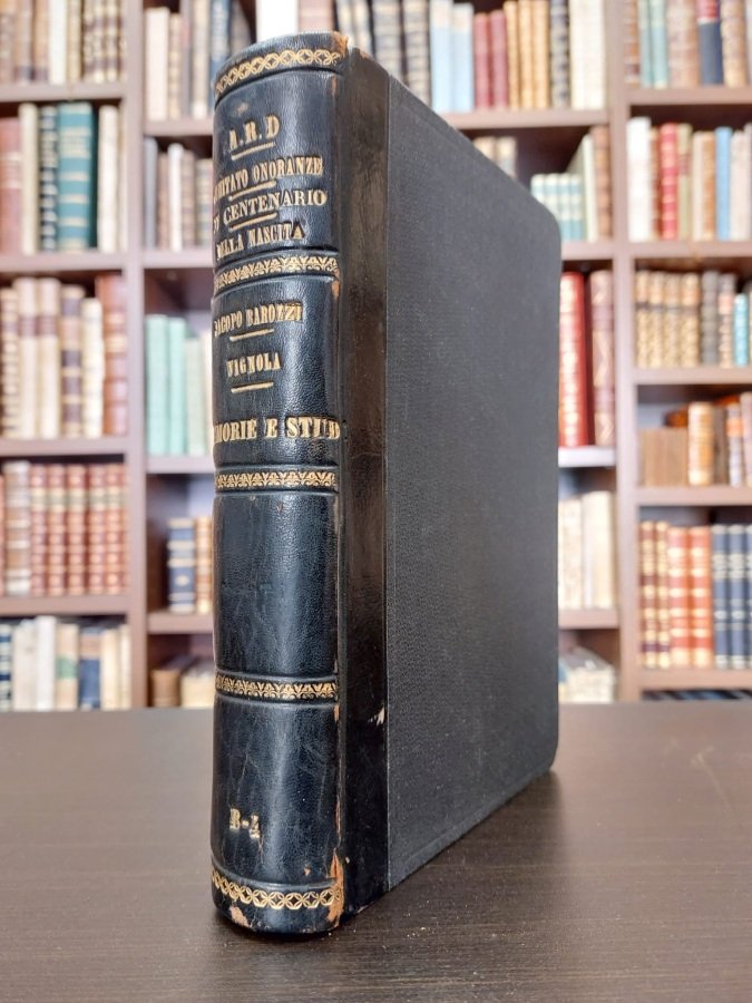 In-8° (cm. 22,9), legatura coeva in mezza pelle nera con titoli e fregi in oro al dorso, tagli marmorizzati in rosso; pp. VII [1] 392 [2] in stato molto buono (lievi e sporadiche fioriture). Edizione pubblicata nel IV centenario dalla nascita per cura del comitato preposto alle onoranze. Opera riccamente illustrata da numerose tavole in nero su carta patinata fuori testo, di cui 1 con il ritratto di Jacopo Barozzi all'antiporta. Antica firma di possesso al frontespizio e all'occhietto. Esemplare molto buono. (NG4)