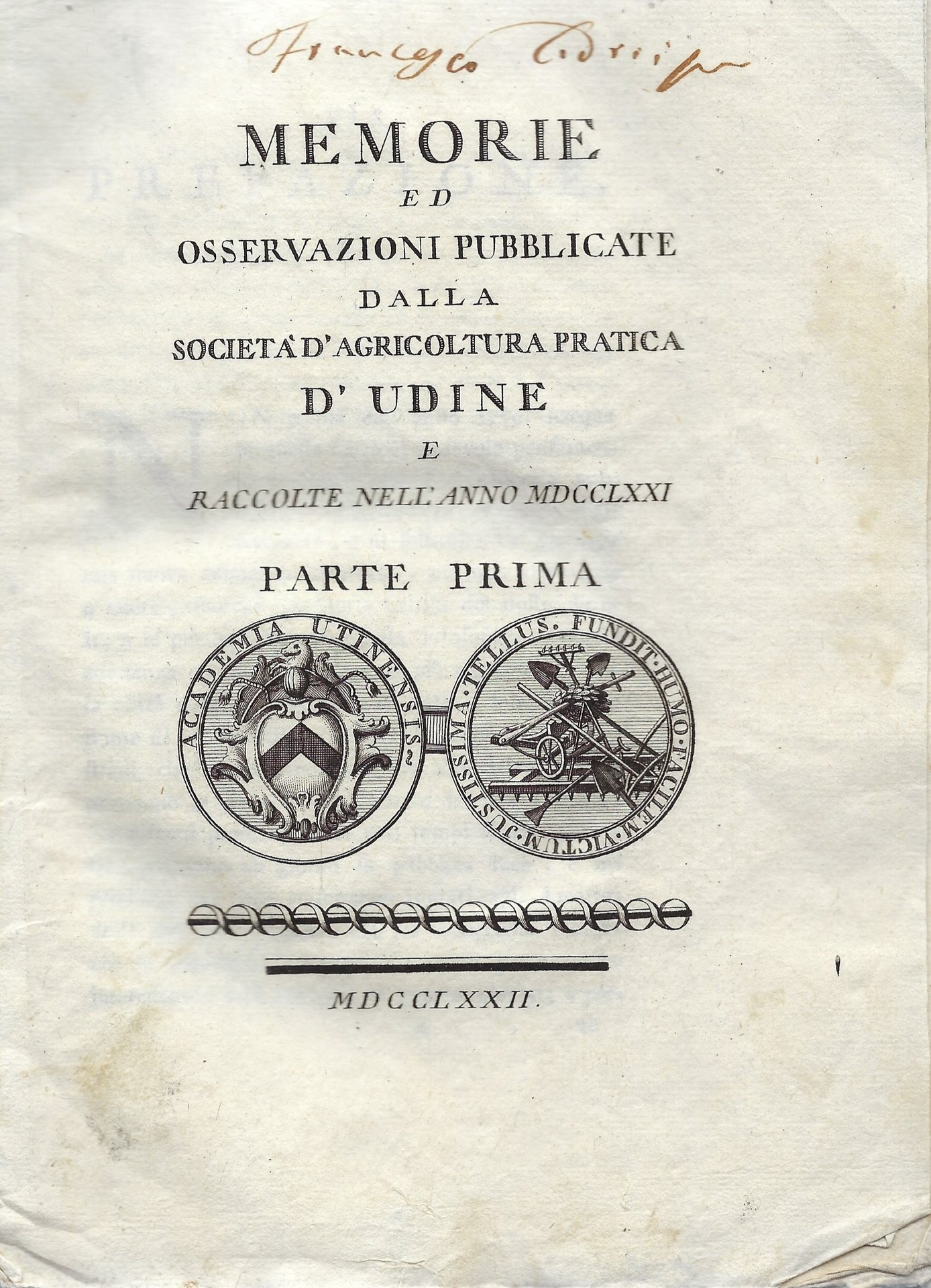 Memorie ed Osservazioni pubblicate dalla Società D' Agricoltura Pratica d' Udine e raccolte nell'anno MDCCLXXI Parte Prima (ed unica)