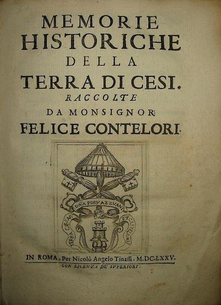 4to (cm. 22), 107(1) pp. Grande stemma calcografico al frontis. Capilettera, fregi e due figure xilografiche n.t. Legatura in piena pergamena antica. Lieve ondulazione all’angolo inferiore del frontis. e sporadiche macchioline su poche carte, altrimenti ottimo esemplare. L’opera si riferisce a vicende storiche della Terra di Cesi, di Terni, di Sangemini, di Spoleto, ecc. La sua paternità fu messa in dubbio da un libello pubblicato a Napoli da R.A. Bruni l’anno successivo, ma in seguito (1680) per ribadire l’attribuzione delle ‘Memorie’ al Contelori, venne stampata, sempre a Napoli, una ‘Antirisposta apologetica’ corredata da documenti dell’Archivio Segreto Vaticano e della cancelleria di Cesi. Lozzi (1202): ‘Raro’. Ranghiasci, p. 58. Raro anche per Platneriana (p. 102).