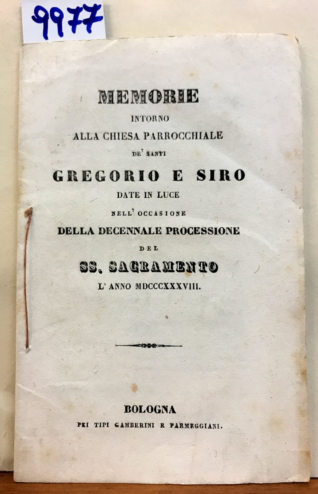 MEMORIE INTORNO ALLA CHIESA PARROCCHIALE DE' SANTI GREGORIO E SIRO DATE IN LUCE NELL'OCCASIONE DELLA DECENNALE PROCESSIONE DEL SS. SACRAMENTO L'ANNO MDCCCXXXVIII.