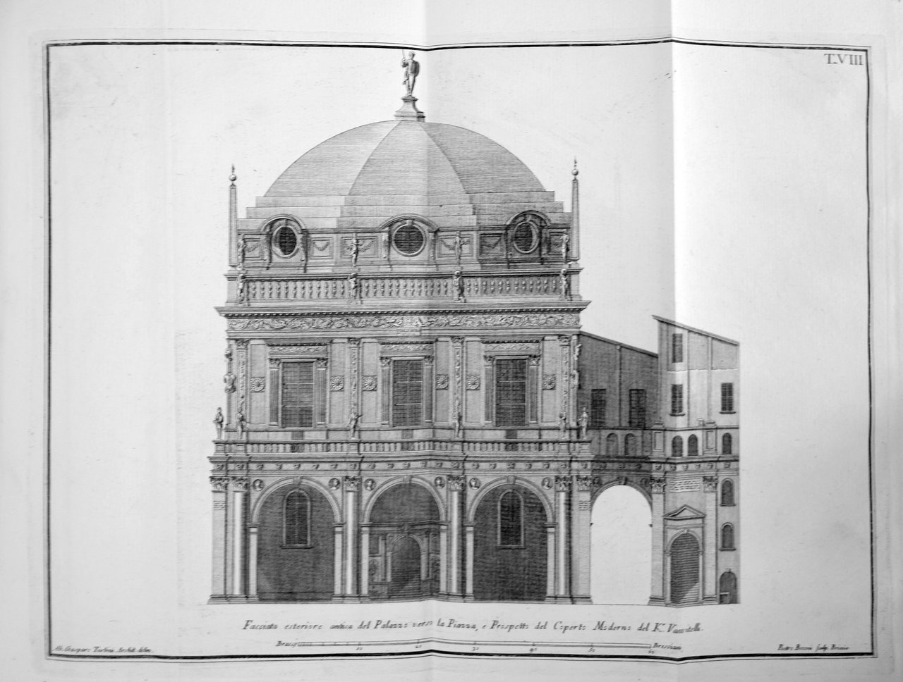 In-4 gr. (mm. 360x250), mz. pelle coeva, filetti e titolo oro al dorso, pp.num. VIII,163, cc.nn. 2 (di Indice), ornato da una bella vignetta incisa al frontespizio, da una testata alle armi dei nobili Deputati pubblici della città di Brescia alla dedica, da 9 pregevoli testate disegnate da F. Battaglioli ed inc. in rame da F. Zucchi con vedute e monumenti della città, oltre a 10 grandi iniziali figurate a vignetta e 5 finalini.Il volume è arricchito da un importante corredo iconografico costituito da 12 tavole fuori testo disegnate da Gaspare Turbini ed inc. in rame da Pietro Beceni, che raffigurano pianta, sezioni e prospetti del "Palazzo Pubblico delle Ragioni", il cui famoso salone, distrutto da un incendio nel 1573, fu ristrutturato con il progetto di Luigi Vanvitelli (1700-73). In Appendice Lo Zamboni (1723-1797) pubblica alcune scritture dei più celebri architetti e pittori intorno al Palazzo della Loggia e alla nuova cattedrale provenienti dagli archivi della città e precisamente: Sansovino, Alessi, Palladio, Rusconi, Tiziano, Todeschini, Buzzi, Binago e Vanvitelli. "Edizione originale" della più importante opera dedicata all'architettura di Brescia.Cfr. Cicognara,4128 che dichiara 11 tavole: Opera ben fatta e utilissima.. - Berlin Katalog,I,2724 (pure con 11 tavole) - Schlosser Magnino, p. 569.Bellissimo e fresco esemplare su carta forte.