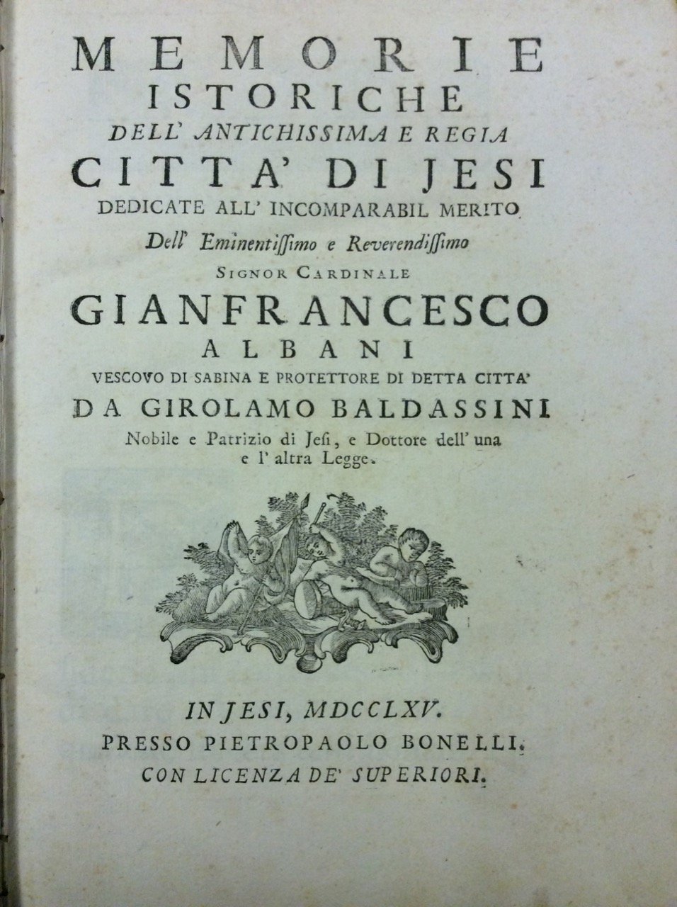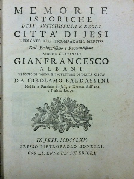 In-8 gr. (mm. 262x177), 3 opere in 1 volume, mz. pelle coeva (lievi abras.), tagli marmorizzati, pp.num. XXIV,392 [i.e. 390] + 1 c.b.;19;CLXIV (di Appendice); con 1 tavola epigrafica fuori testo inc. in rame; ornato da pregevoli testate, grandi capilettera figurati a vignetta, e finali inc. su legno.Importanti Memorie' della città di Jesi a partire dalle origini (dai Liburni, i Siculi .. i Galli e quindi dai Romani), divise in V libri, dedicate all'incomparabil merito dell'Em.mo Sig. Cardinale Gianfrancesco Albani Vescovo di Sabina e protettore di detta città, da Girolamo Baldassini nobile e patrizio di Jesi, e dottore dell'una e l'altra legge.(Segue) il raro opuscolino (come precisa il Lozzi): "Risposta alla dissertazione del Sig. Abate D. Filippo Vecchietti intorno alla Città Ausina". (Segue) "Appendice di tutte le bolle, brevi, lettere, privilegj ed istromenti" cavati quasi tutti da pergamene antiche, che si conservano nell'Archivio Sgreto di questa Segreraria Priorale, e altrove e che si citano nelle Memorie istoriche della città di Jesi', distribuite per orgine cronologico. "Rara edizione originale".Cfr. Lozzi,I,2228 - Coleti Catalogo delle istorie particolari delle città e luoghi d'Italia (1779),I, p. 89.Ca. 60 carte con bruniture, ma complessivam. esemplare marginoso in buono stato di conservazione.