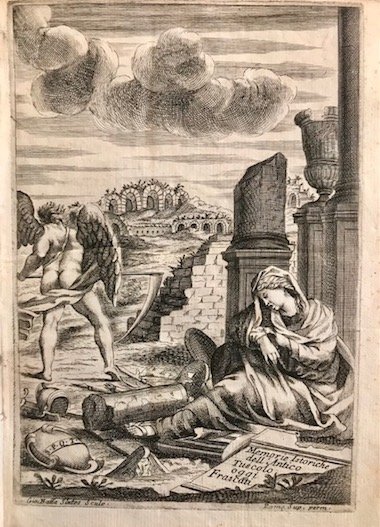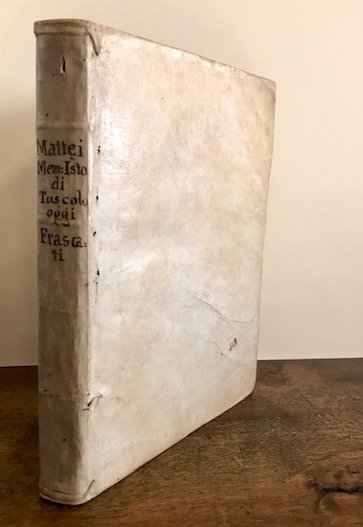 4to (cm. 21,5), 6 cc.nn., 195(1) pp., 8 cc.nn. Bella antiporta calcografica f.t. incisa da G.B. Sintes. Stemma della città di Tuscolo al frontespizio. Alcune illustrazioni, iniziali e fregi xilografici n.t. Legatura coeva in pergamena rigida con titolo ms. al ds. (alcuni minuscoli forellini di tarlo). Tagli colorati. Esemplare in eccellente stato di conservazione. Provenienza: Collezione privata ‘Banzi’ (etichetta cartacea al contropiatto anteriore). Edizione originale. Lozzi, 2025: ‘Istoria veramente rara.’; Ranghiasci, p. 271.