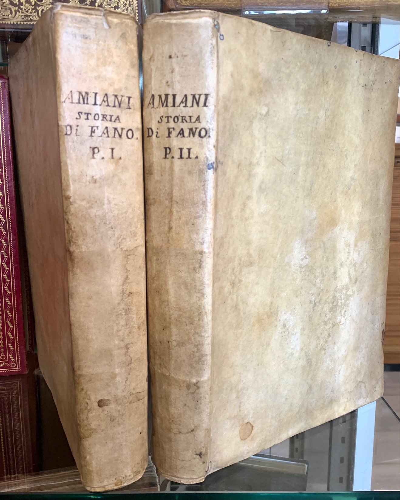 >2 volumi in folio (mm 320x220), pp. VIII, XXIII, (1), 472; (4), 356, CXIX, (1); legatura coeva piena pergamena, titoli manoscritti ai dorsi. Nato a Fano nel 1702 da Domenico, entrato nel Consiglio della comunità il 20 nov. 1725, si laureò l'anno successivo a Macerata. Le ”Memorie”, seppur parzialmente lodate dal Muratori e impresse in grande formato su carta distinta, non riscossero quell'unanime plauso che l'autore si attendeva. Sono narrate in ordine cronologico dalle origini al 1751, si concludono con un'appendice contenente l'Elenco di tutti i vescovi della città di Fano, una "Raccolta di tutte le bolle, brevi, diplomi, lettere, privilegi, instrumenti, che si citano, distribuita per ordine cronologico" e una raccolta di "Iscrizioni antiche trovate in diversi tempi nella città di Fano, e nel suo Distretto, con alcun'altre, che alla medesima appartengono". Prima edizione di questa non comune storia di Fano, fornisce interessanti notizie anche sulle località limitrofe e sulla basilica che Vitruvio probabilmente fege erigere nel centro cella città. Bell'esemplare fresco e marginoso.