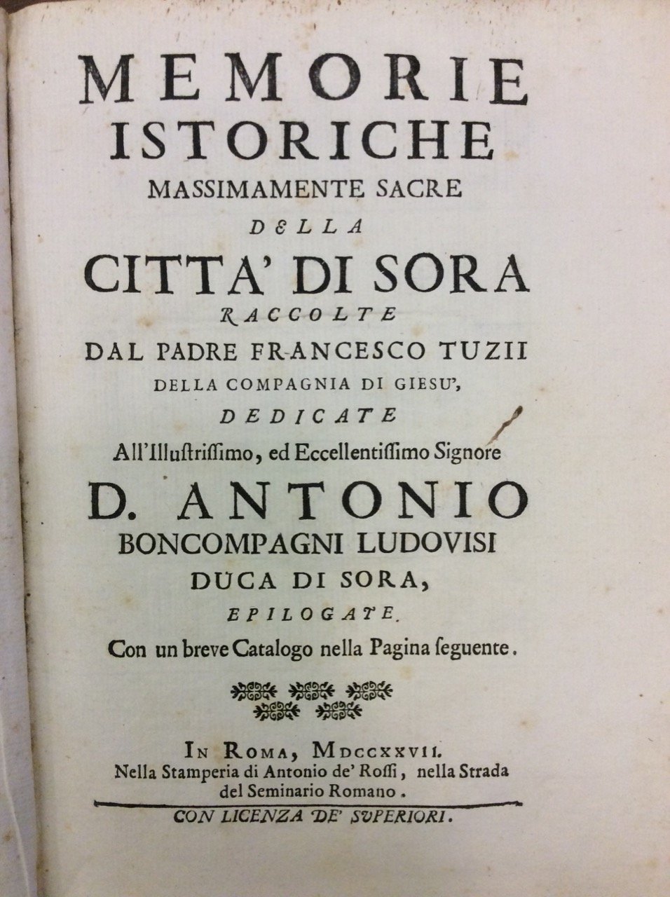 MEMORIE ISTORICHE MASSIMAMENTE SACRE DELLA CITTA' DI SORA. - Raccolte dal Padre F. Tuzii della Compagnia di Giesù.