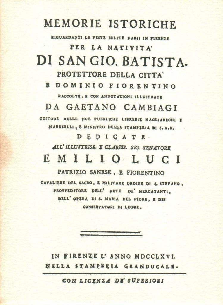 "Memorie istoriche riguardanti le feste solite farsi in Firenze per la nativit‡ di San Gio. Batista", ristampa anastatica edizione 1985, pp. 168, formato 13 x 17.