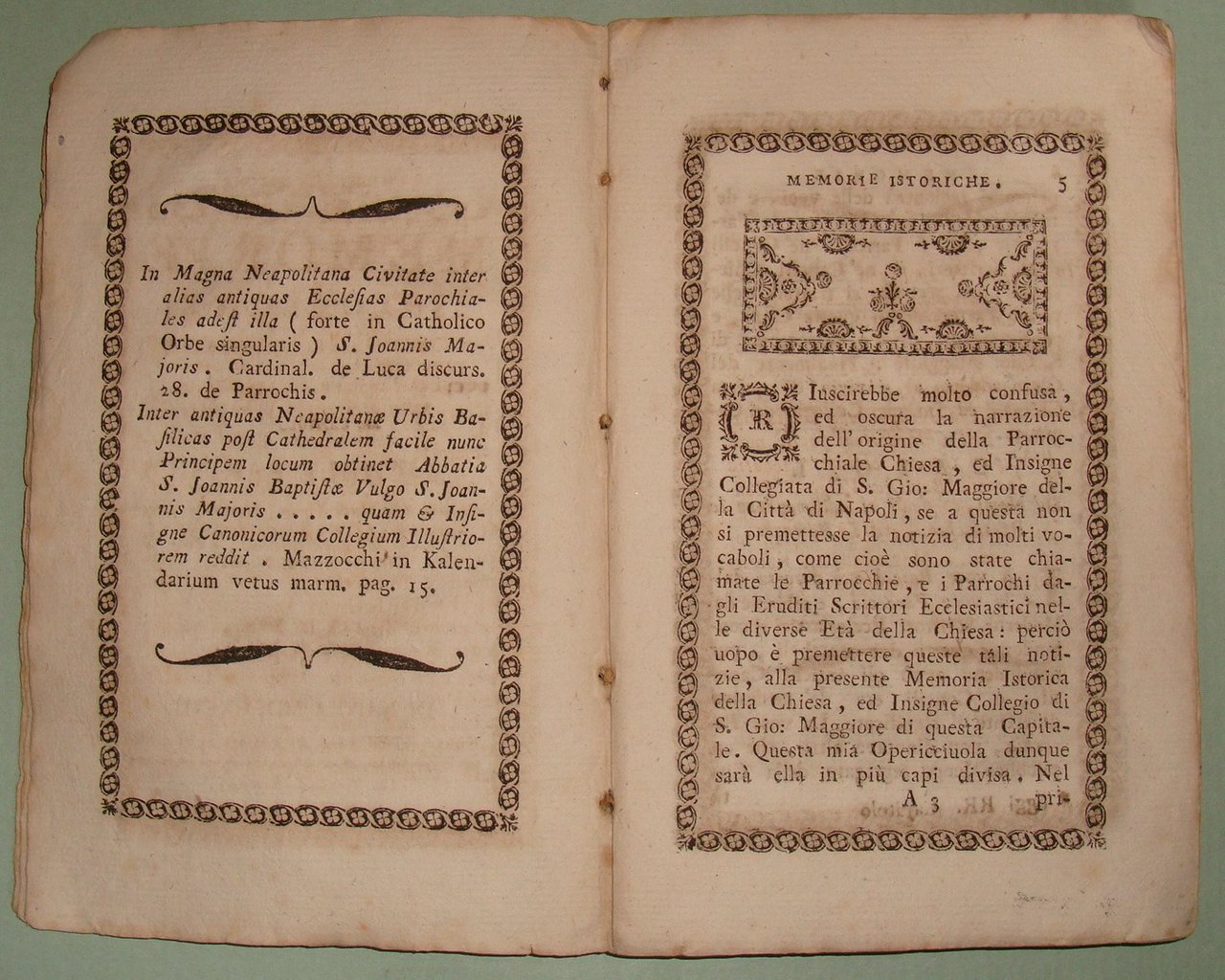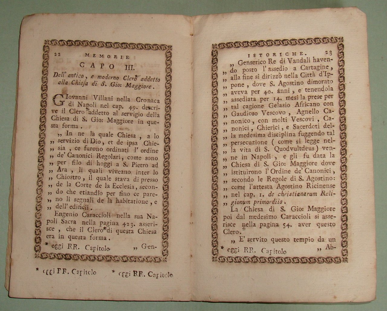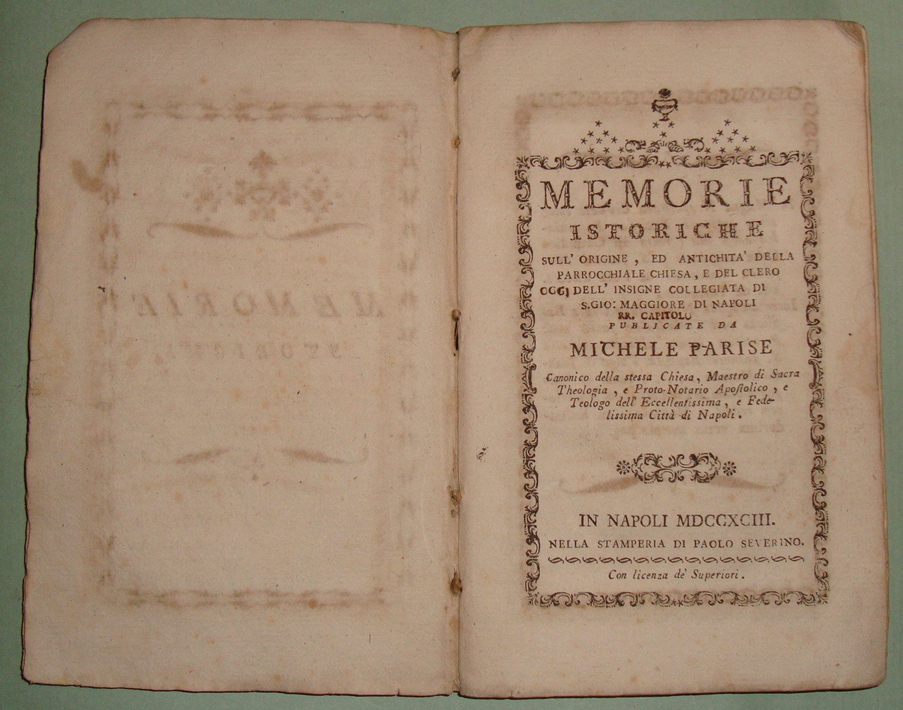 Memorie istoriche sull'origine ed antichità della parrocchiale chiesa e del clero oggi dell'insigne collegiata di S. Gio. Maggiore di Napoli