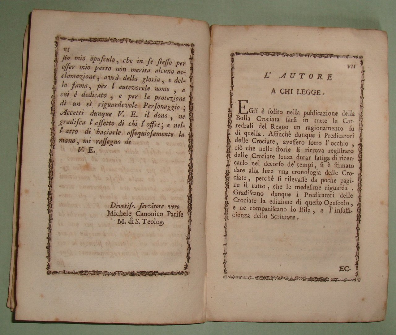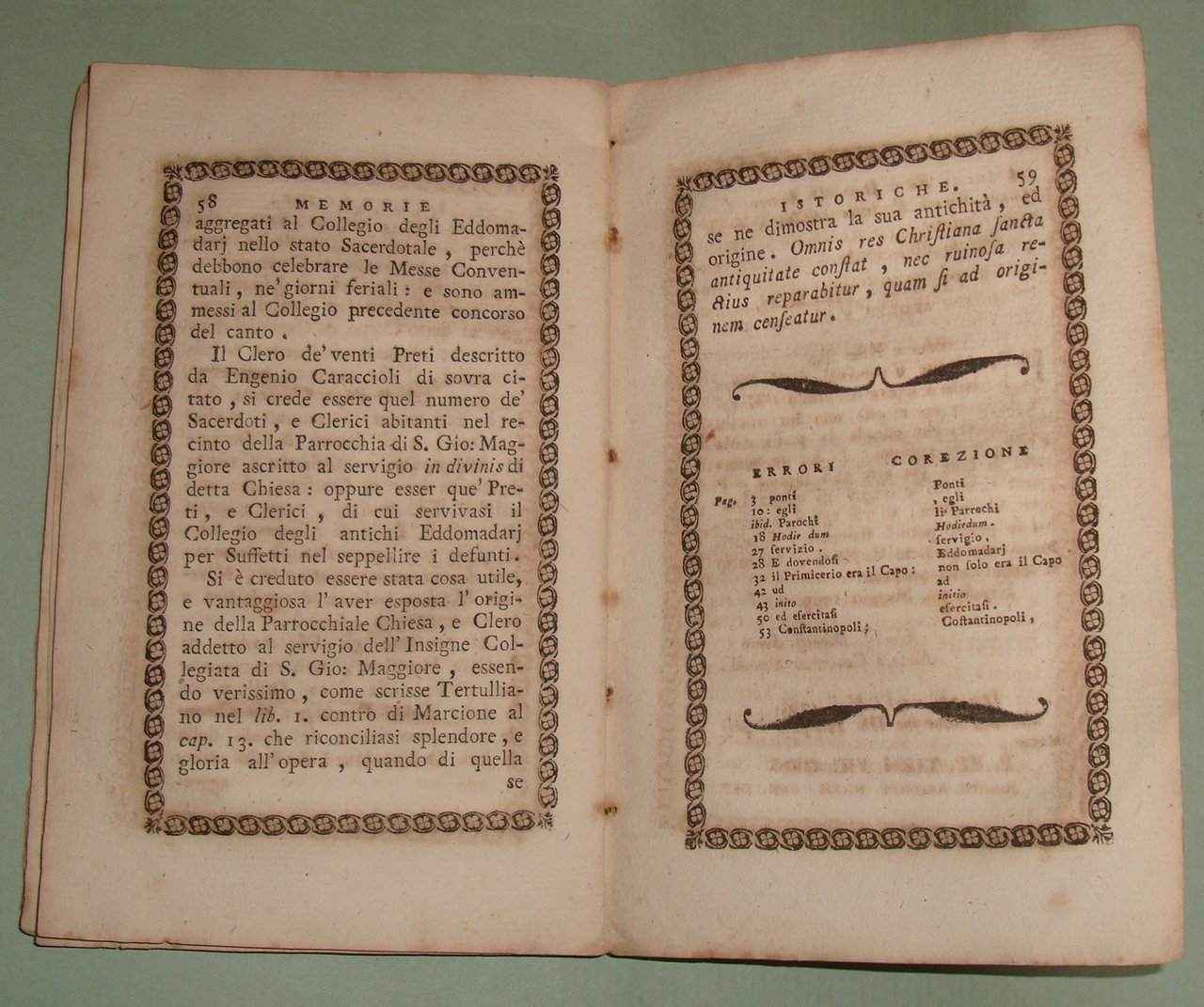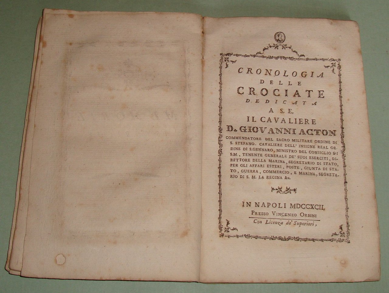 PARISE Michele. Memorie istoriche sull'origine ed antichità della parrocchiale chiesa e del clero oggi dell'insigne collegiata di S. Gio. Maggiore di Napoli. In Napoli, nella stamperia di Paolo Severino, 1793. Rara edizione originale. Lozzi, 3055. Unito: idem. Cronologia delle Crociate dedicata a S.E. il cavaliere D.Giovanni Acton. In Napoli, presso Vincenzo Orsini, 1792. Due opere in un volume in 16mo; pp.59, 3n.nn.; VII, 85, 3n.nn. Testo inquadrato. Legatura coeva in cart.