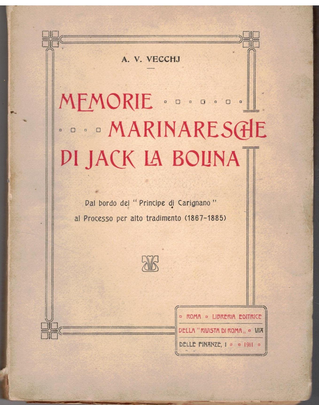 Memorie marinaresche di Jack La Bolina. Dal bordo del "Principe di Carignano" al Processo per alto tradimento (1867-1885) do A. V. Vecchj. Roma, Libreria Editrice della "Rivista di Roma", 1911.