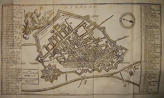 4to (cm. 25,6), 5 Voll., XIX-349(3), X-439(3), VI-522, VI-504(2), XVI-490(2) pp. con 18 tavv. f.t. di cui 2 grandi mappe della città più volte rip. Legature coeve in mz. pelle verde con fili e titoli oro al ds. Ingialliture alle prime tre carte del primo vol., tagli alle cerniere del quinto vol. ma, nel complesso, ottimo esemplare. Ex libris araldico. Seconda edizione, non comune. Lozzi, 1688 (per la prima).
