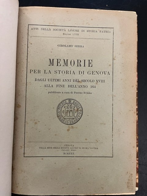 In 4 (cm 20 x 30), pp. XII + 232 + (2) con ritratto di Serra all'antiporta. Qualche fioritura sparsa alle pagine. Legatura moderna in mezza pelle. Conservata all'interno la copertina originale in brossura. Edizione, curata da Bartolomeo Nurra, della Storia di Genova di Girolamo Serra, rimaste inedite per lungo tempo e considerate un gioiello letterario piuttosto che un documento storico.